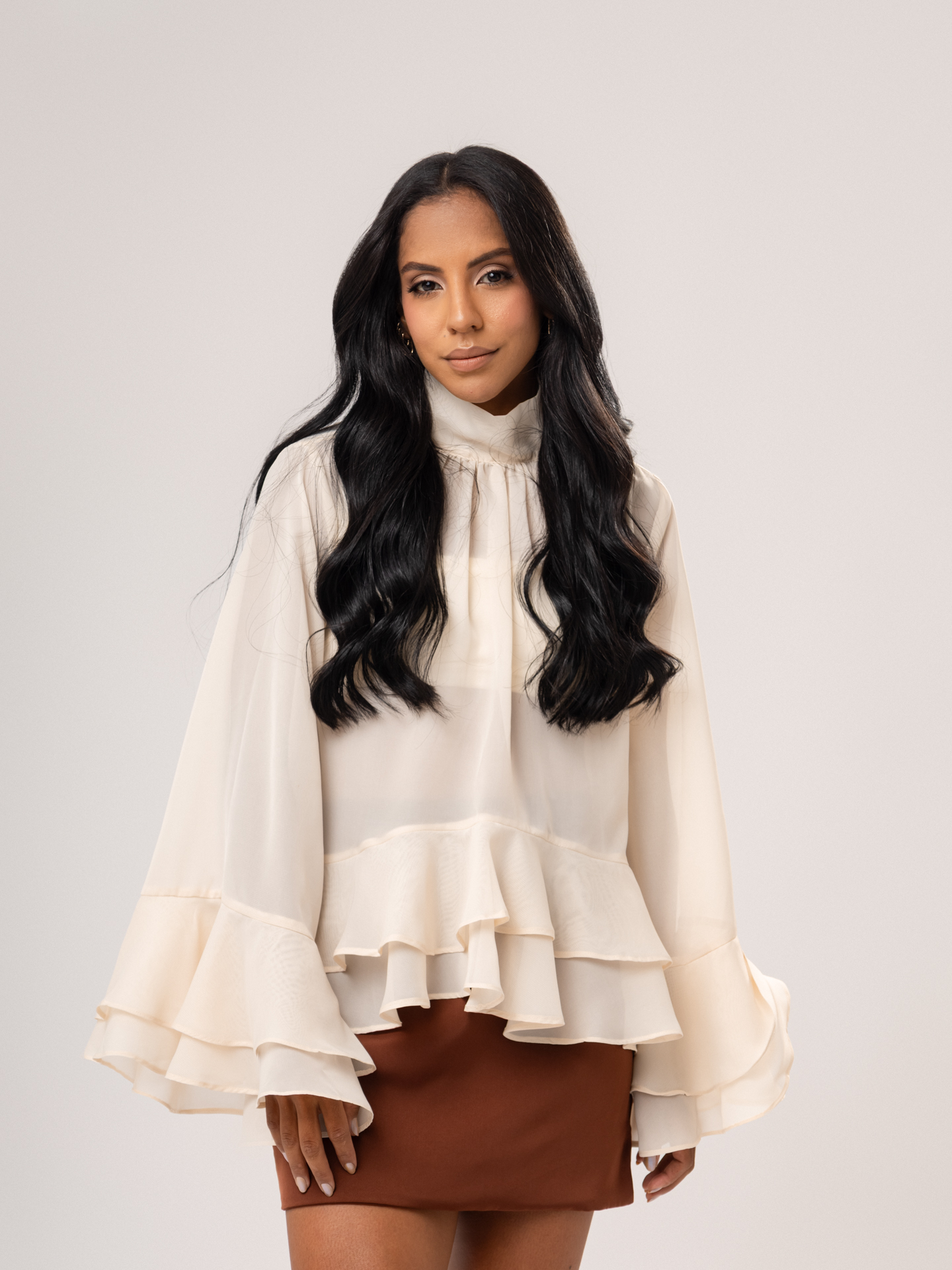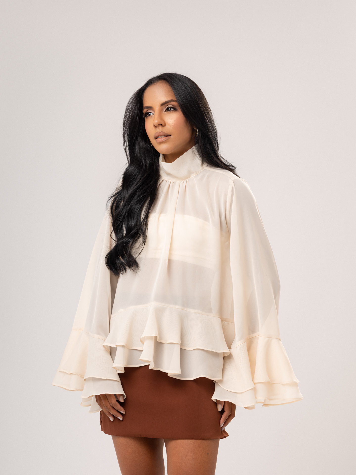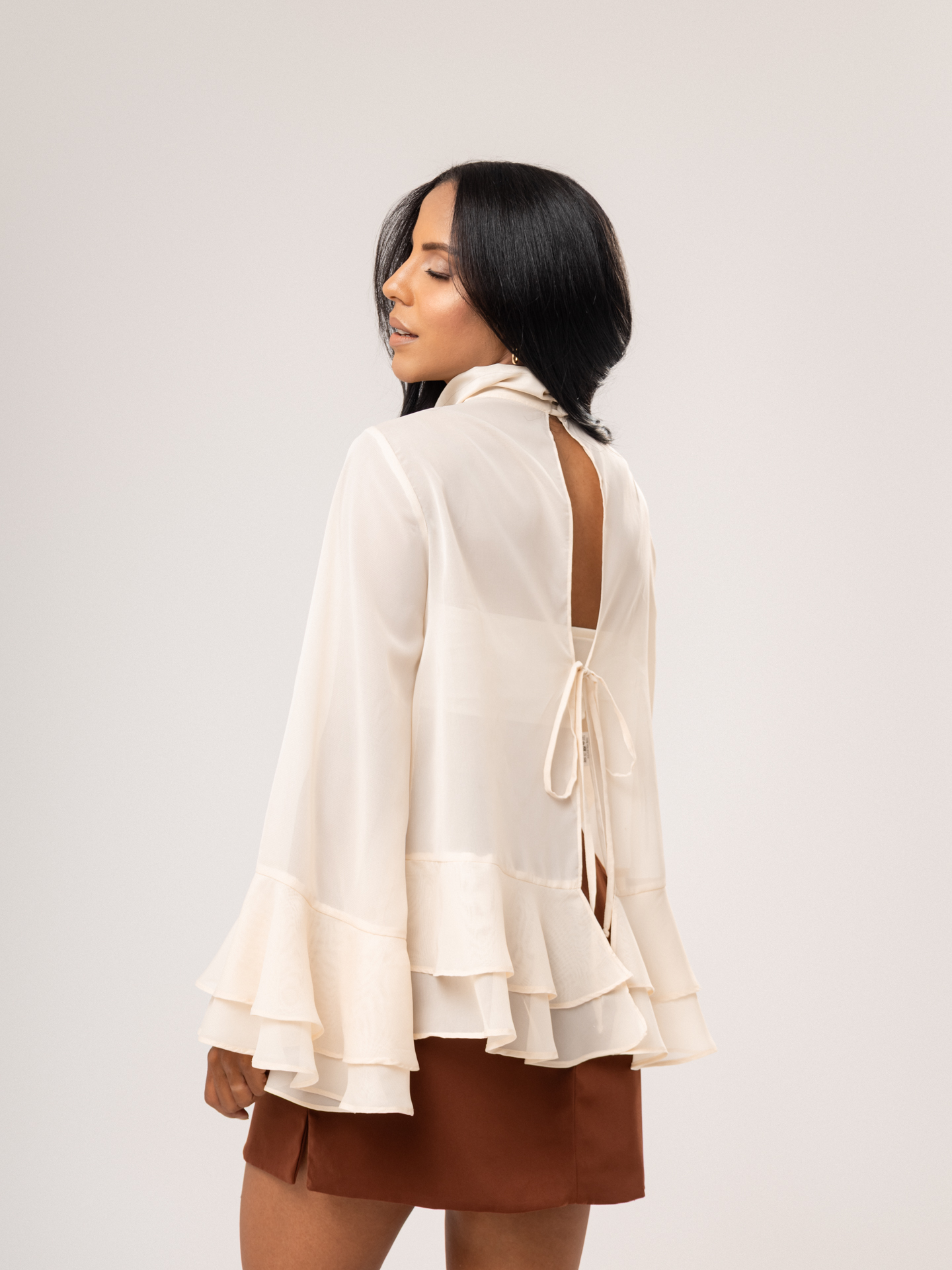Detalhe: Blusa bata em chiffon com transparência. Gola canoa com fechamento em laço na parte de trás. Manga comprida. Babados na barra em toda a peça.