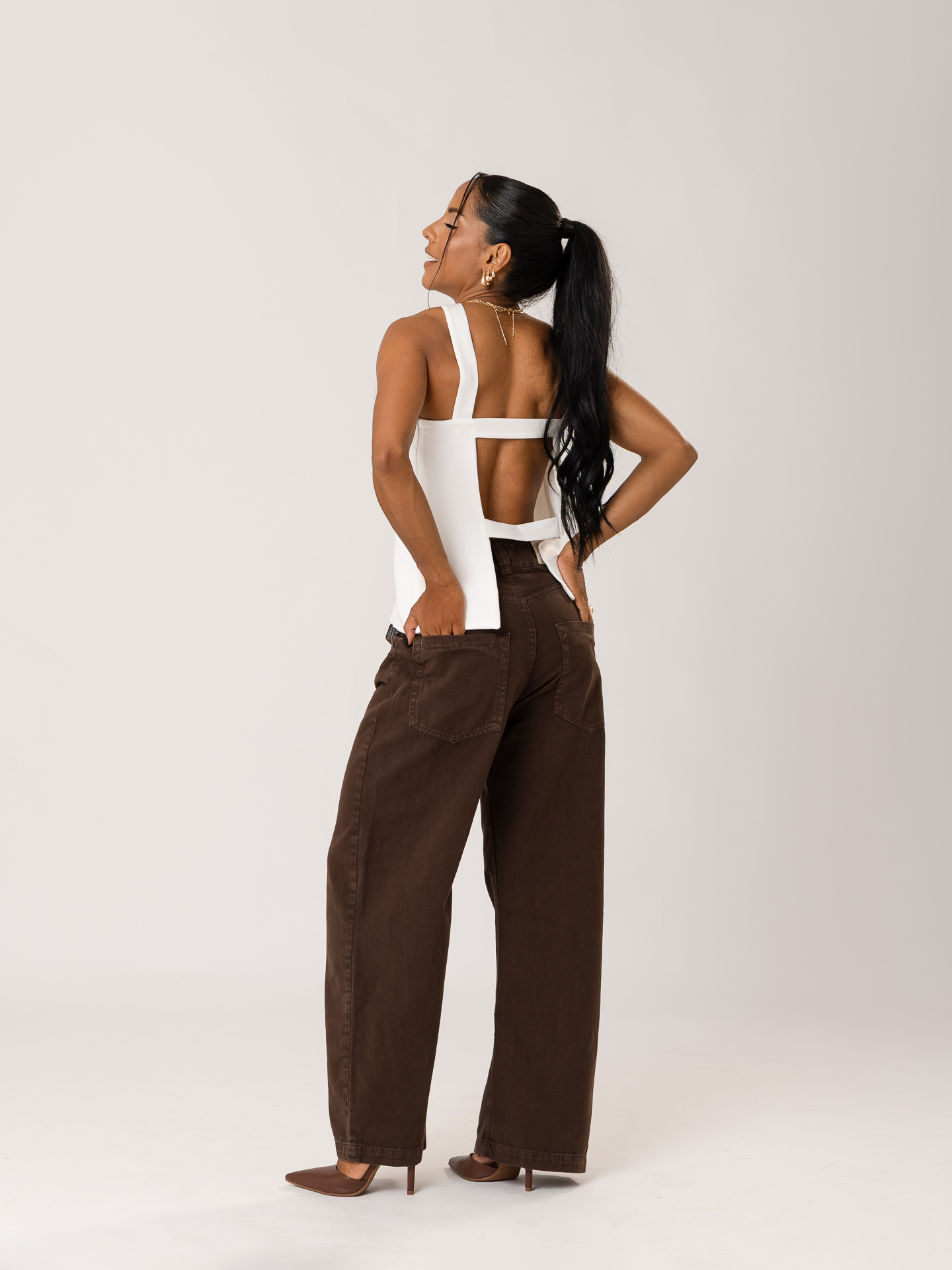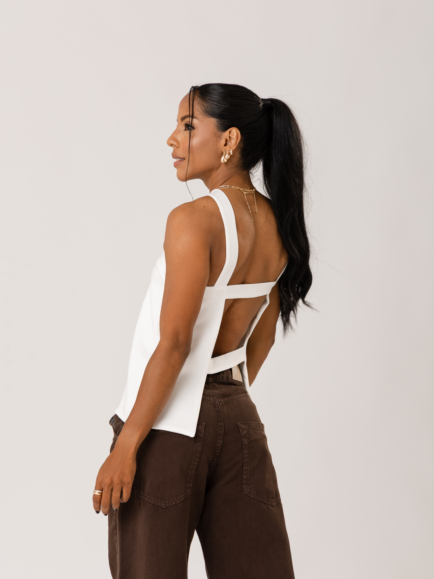 Detalhe: Blusa de modelagem reta, com alça transversal e decotes nas costas.