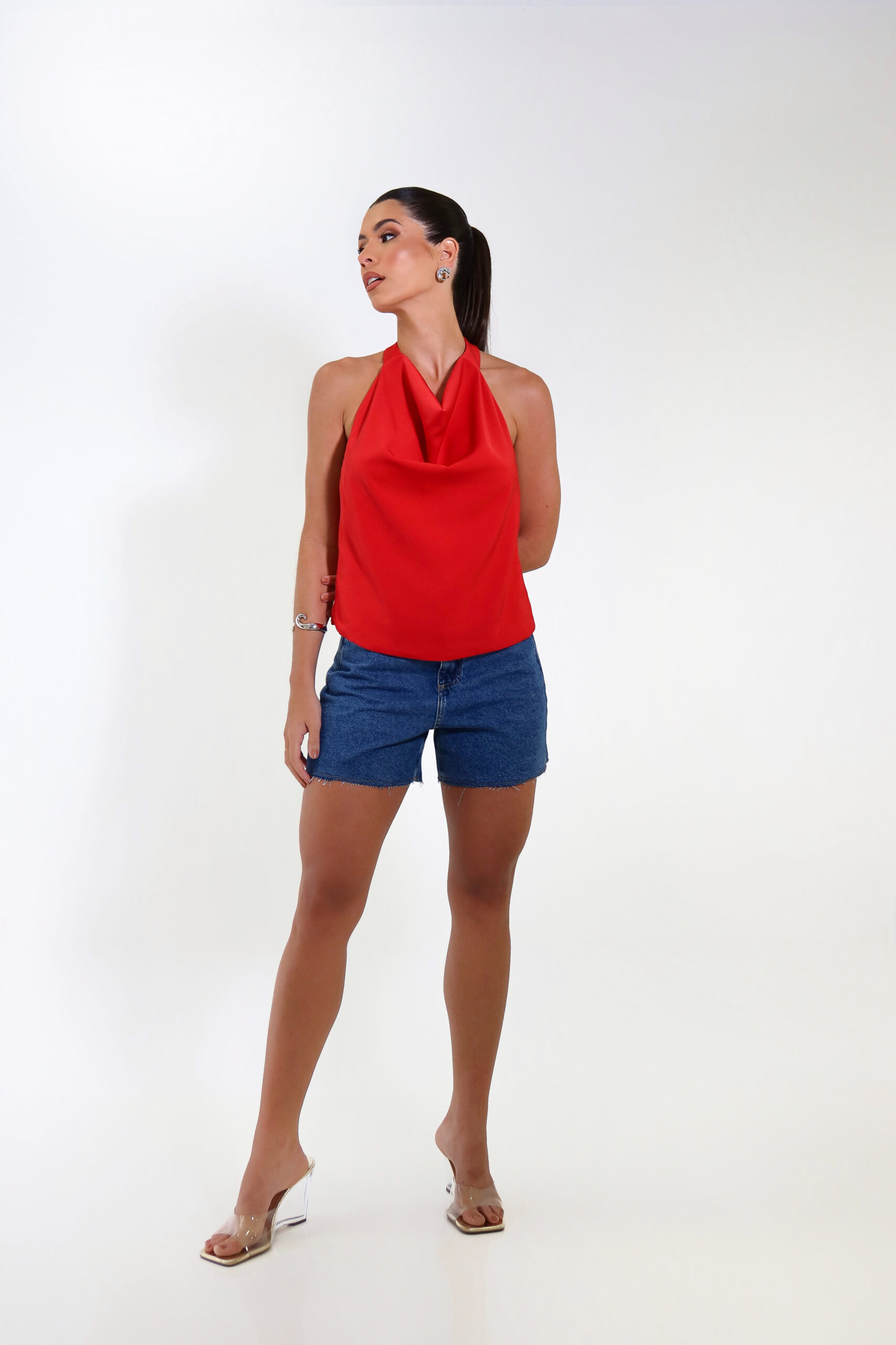 Detalhe: blusa frente única com decote degagê e costas em amarração.