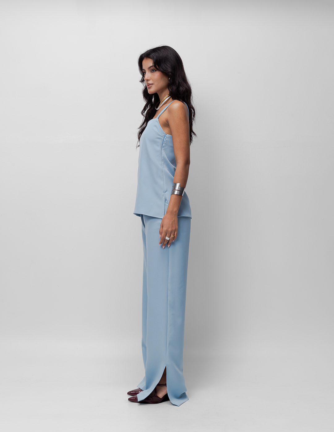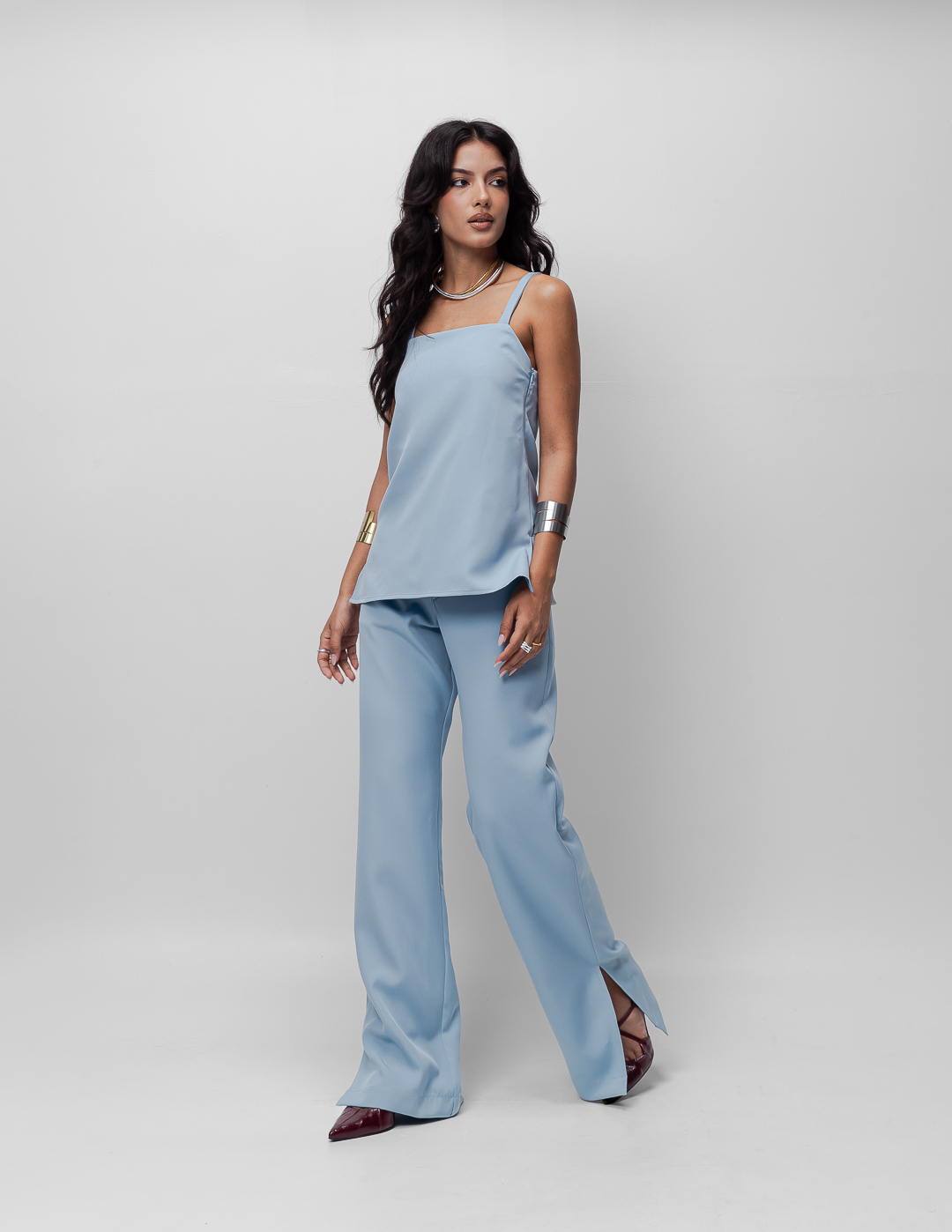 Detalhes: Blusa de alcinha com decote reto. Fechamento em zíper lateral. Fenda lateral.