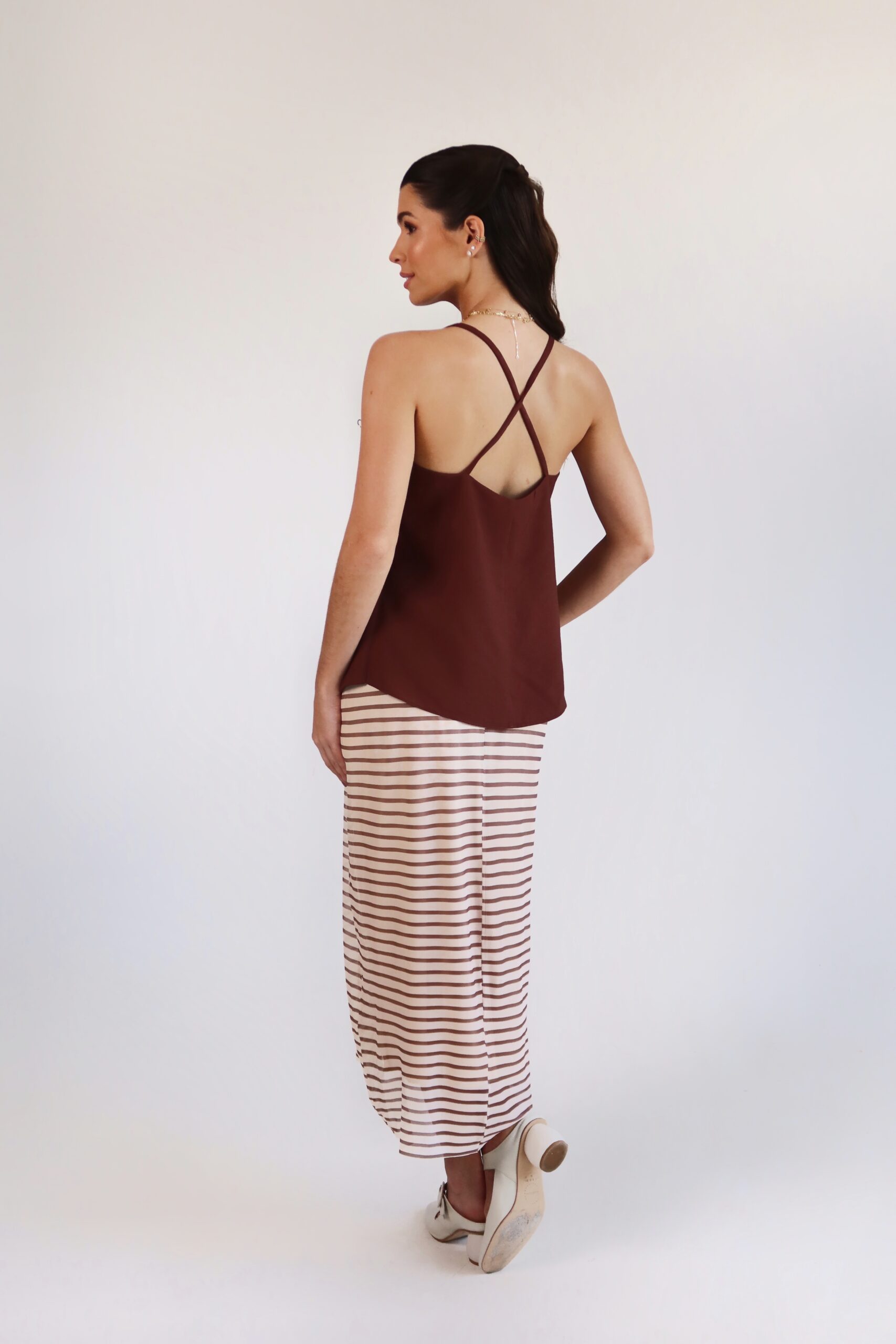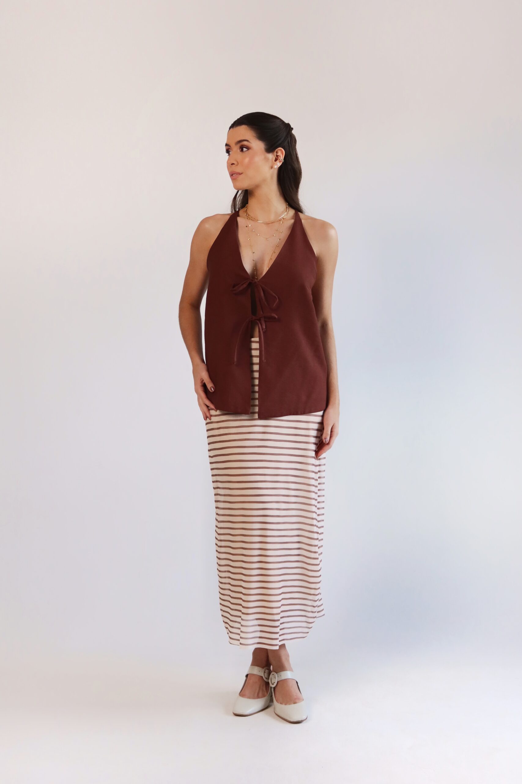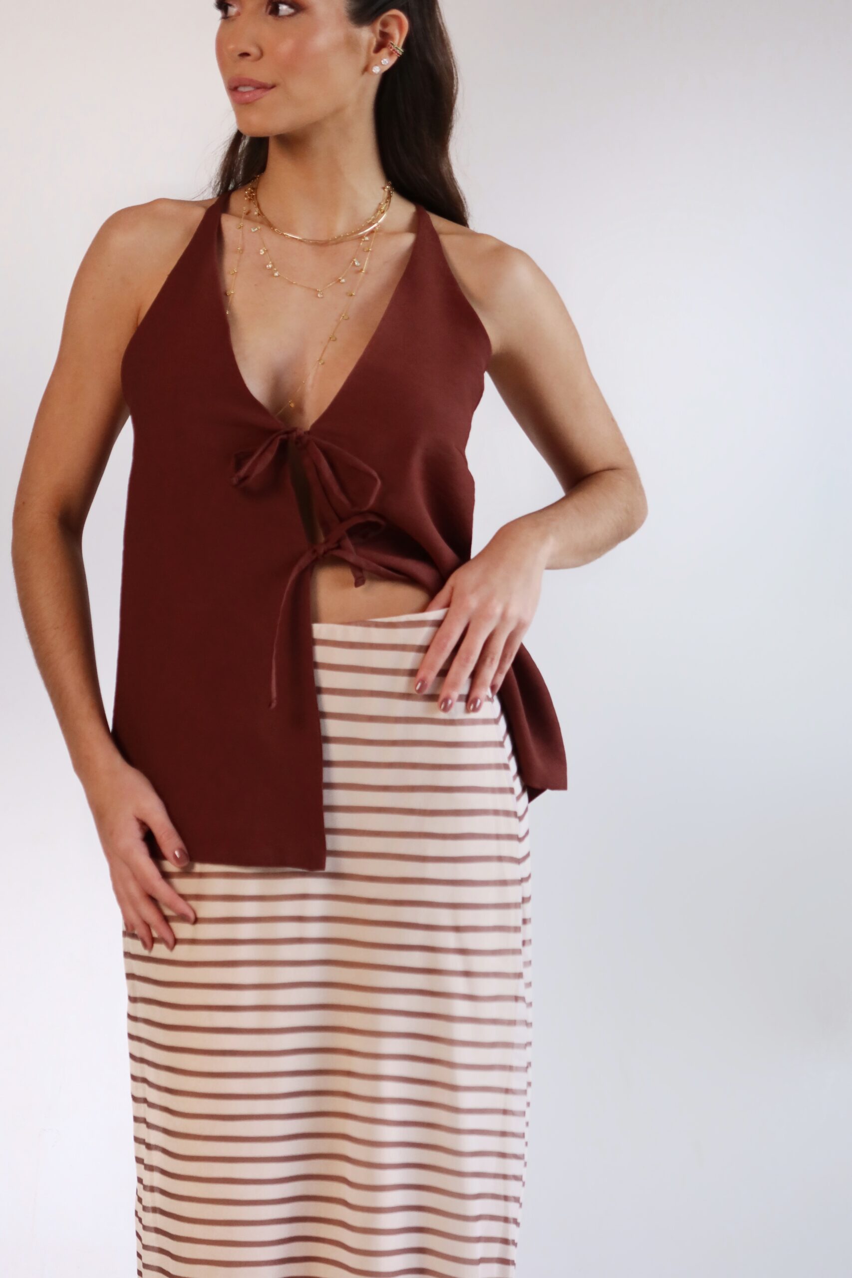 Detalhe: Blusa com decote e fechamento em laços frontal.