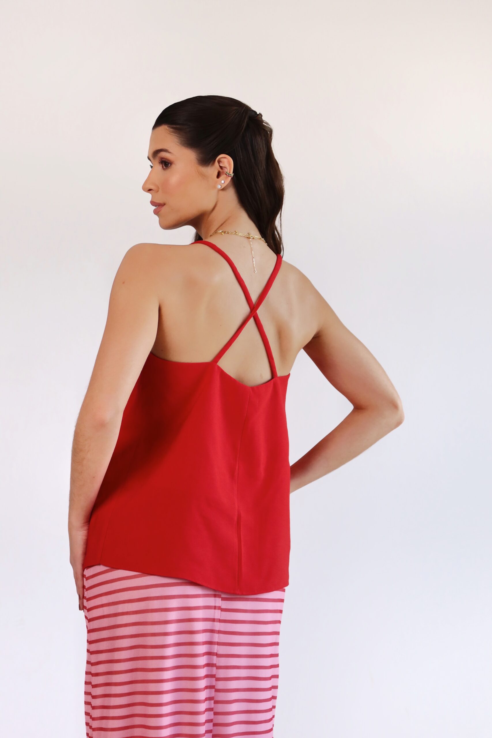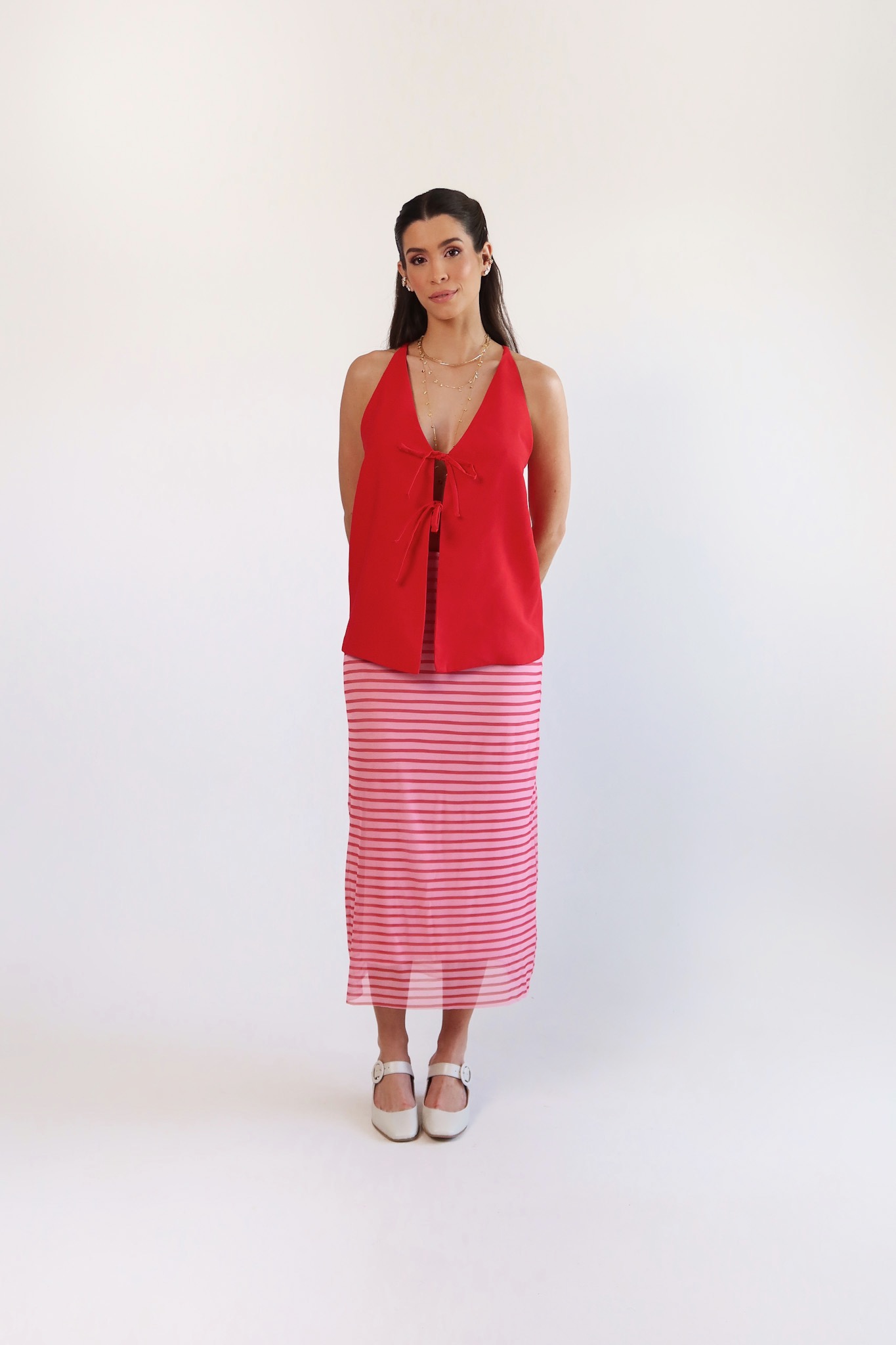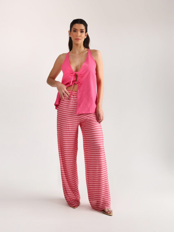 Detalhe: Blusa com decote e fechamento em laços frontal.