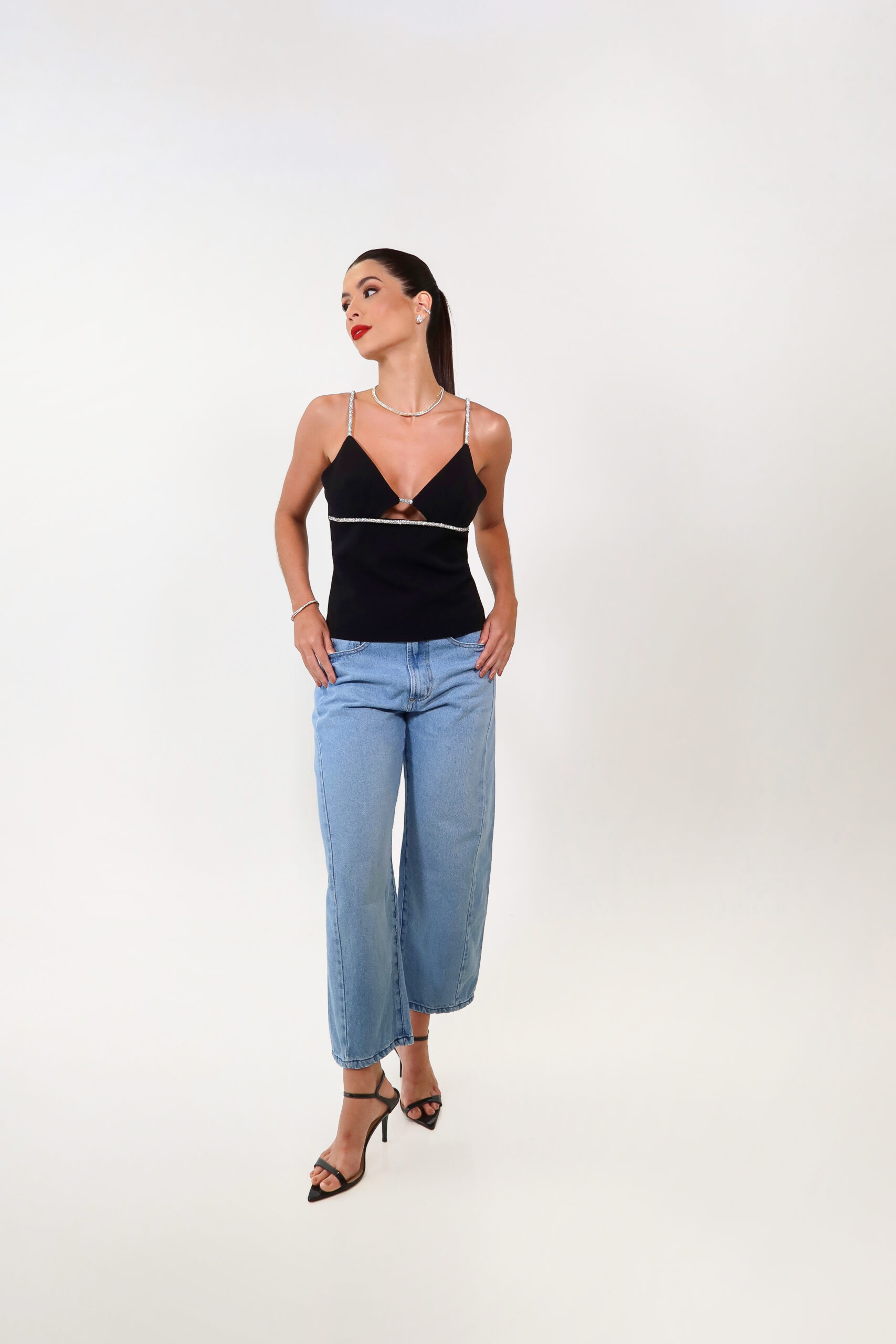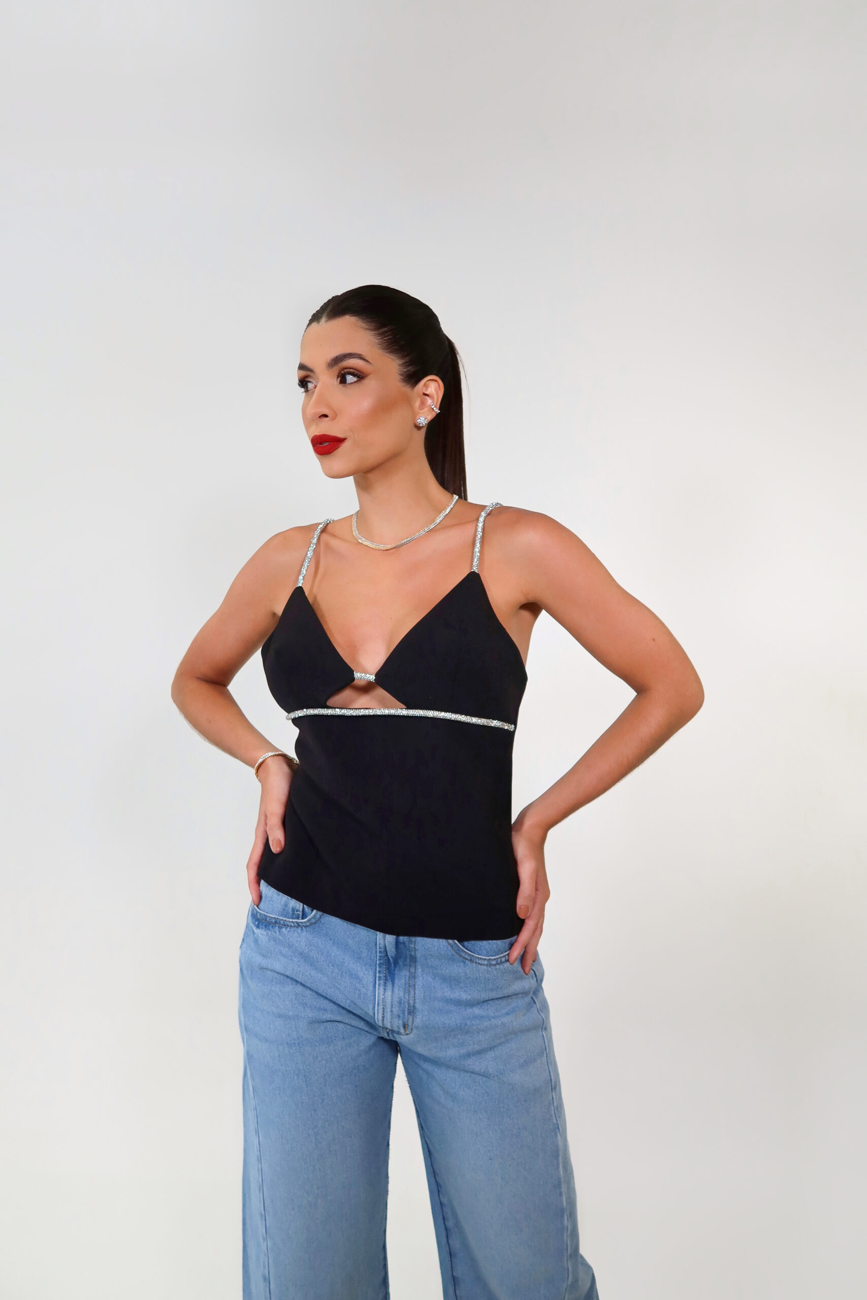 Descrição: Blusa de alcinha decote em V. Detalhe de brilho nas alças.