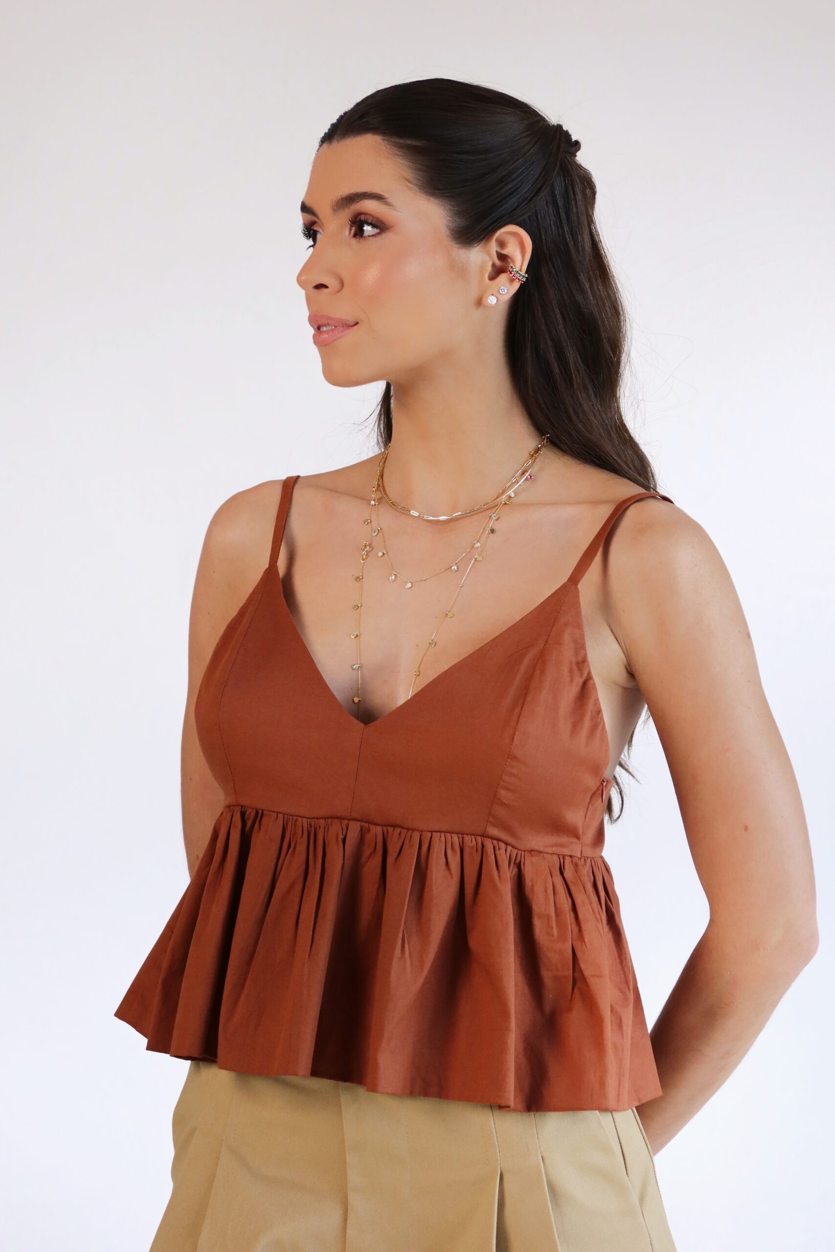 Detalhe: Blusa balonê de alcinha. Busto marcado e decote em V. Fechamento em zíper lateral.