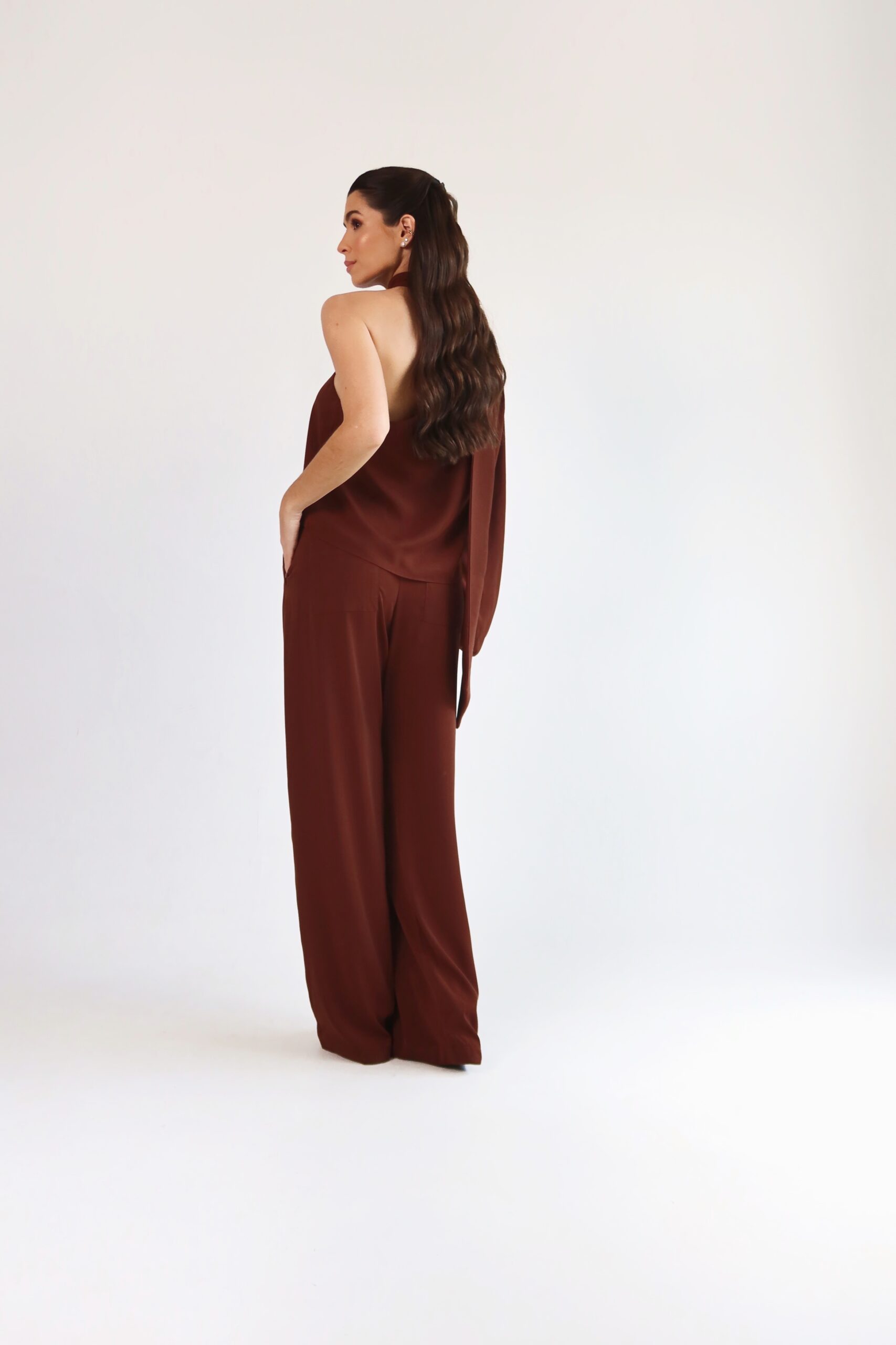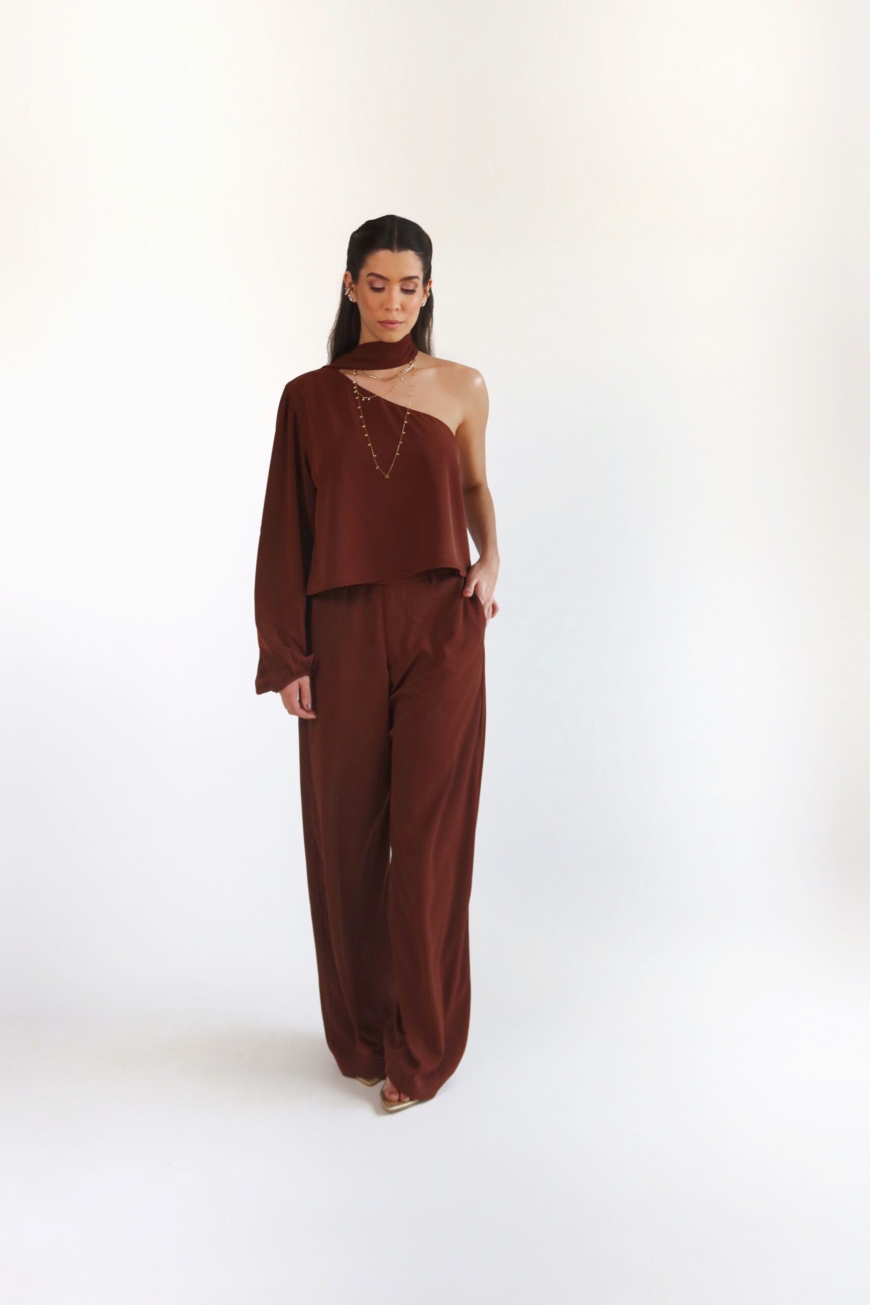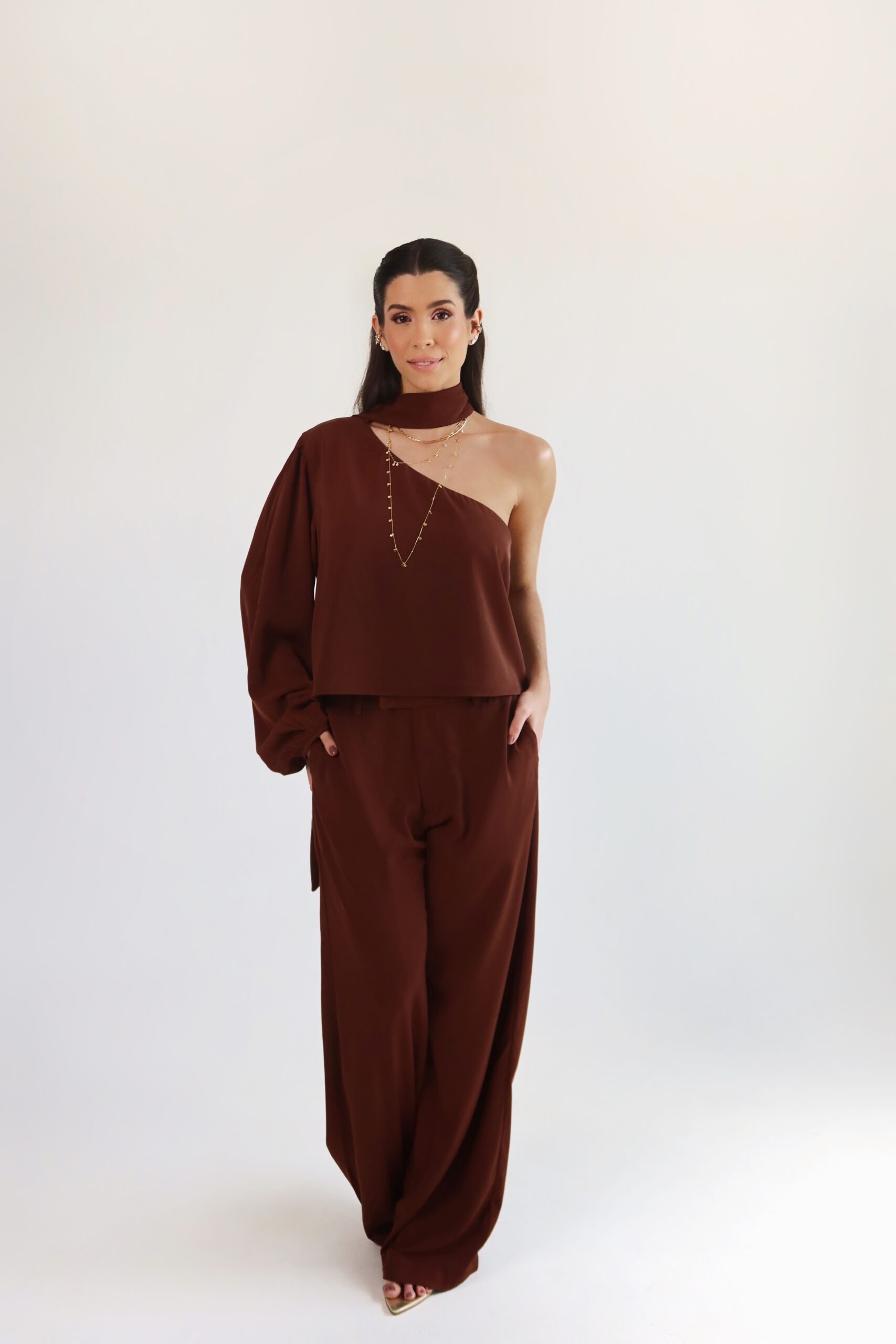 Detalhe: Calça pantalona reta com fechamento em braguilha frontal. Possui passante de cinto. Bolso faca lateral e bolsos traseiros.