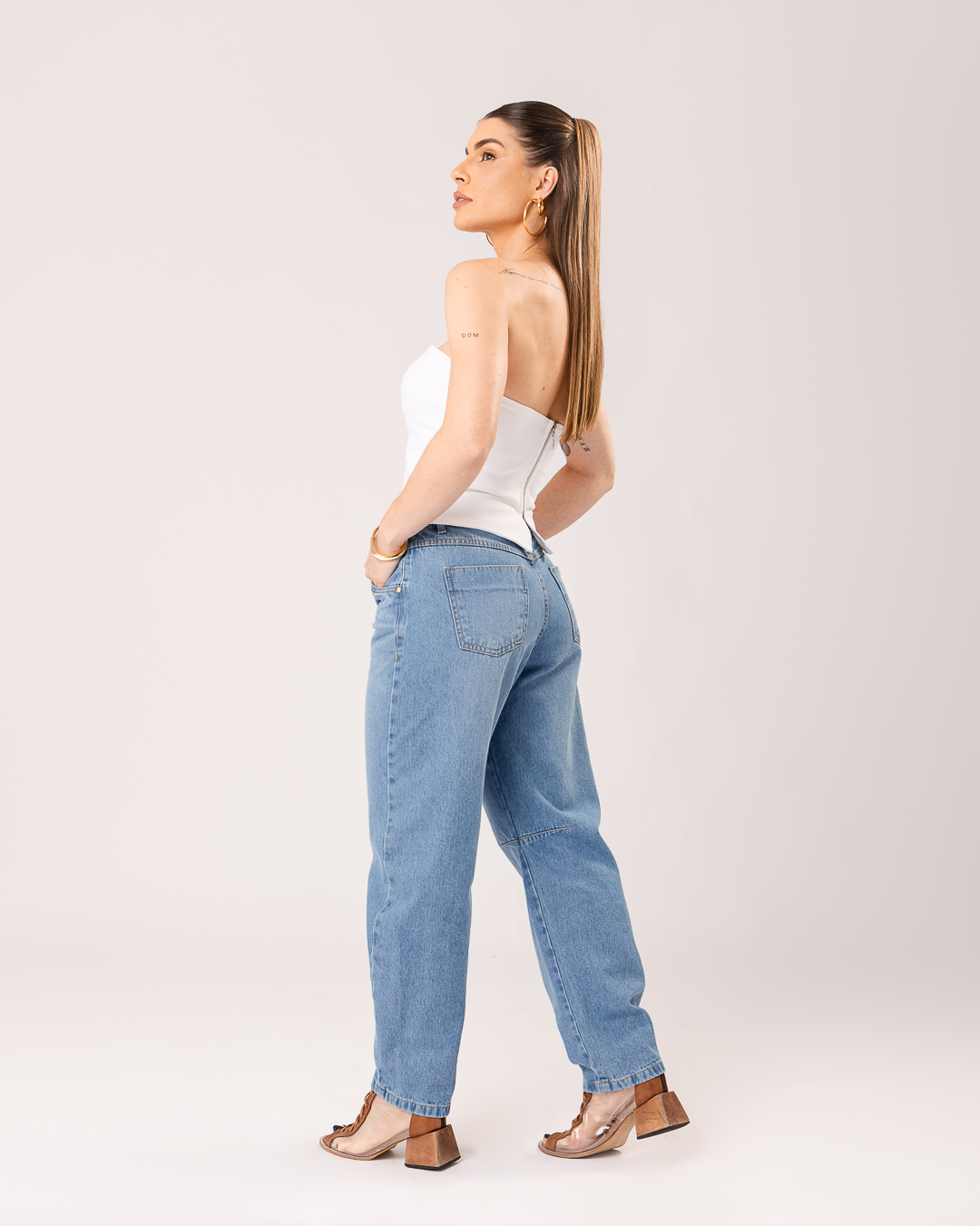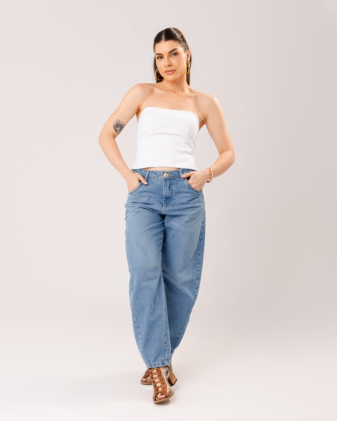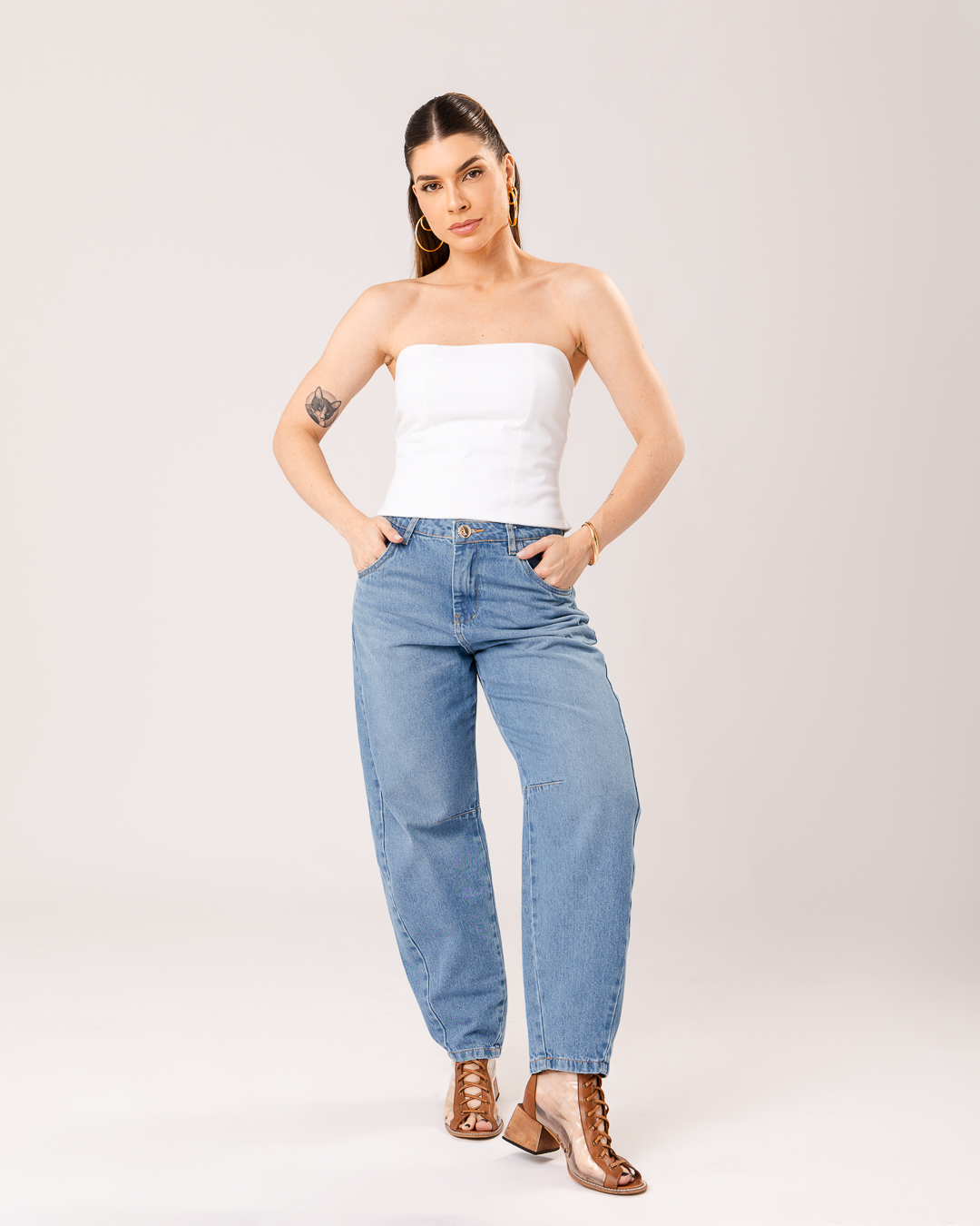 Detalhe: Calça jeans com modelagem estilo barrel.