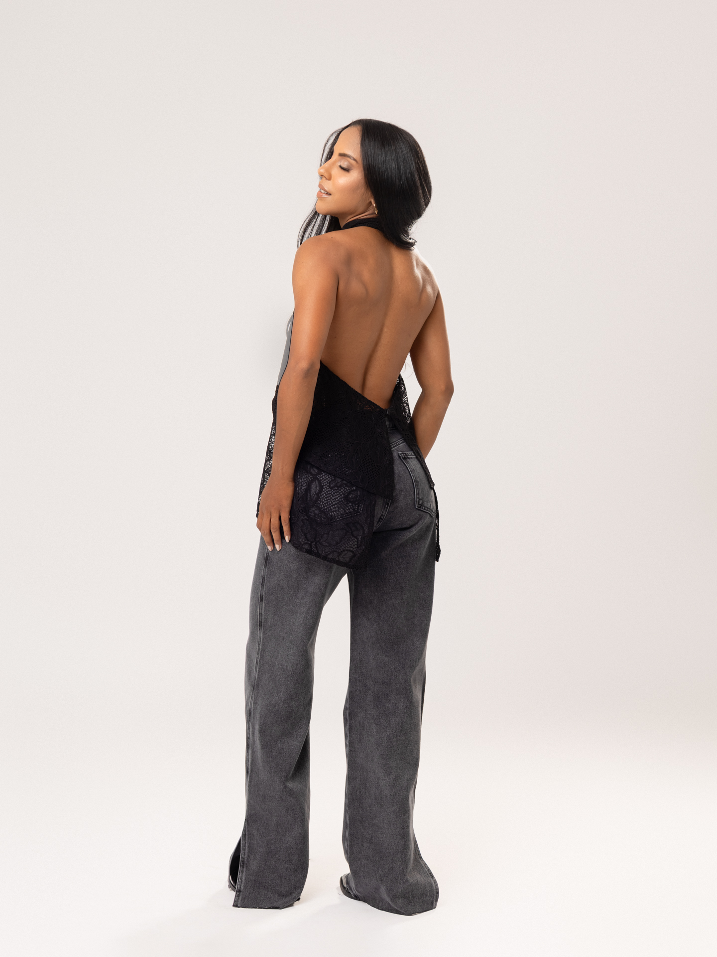 Detalhe: Calça jeans reta.