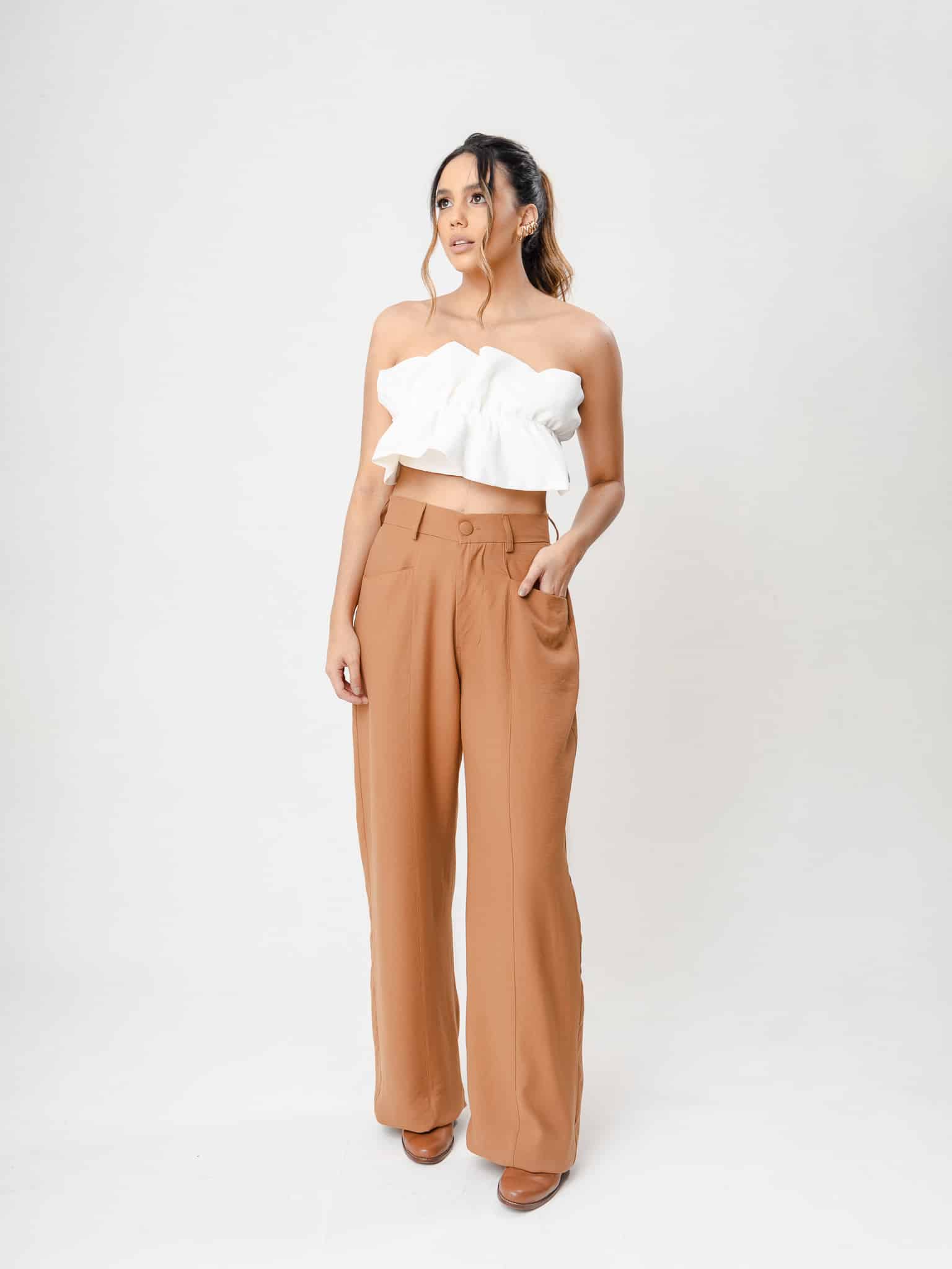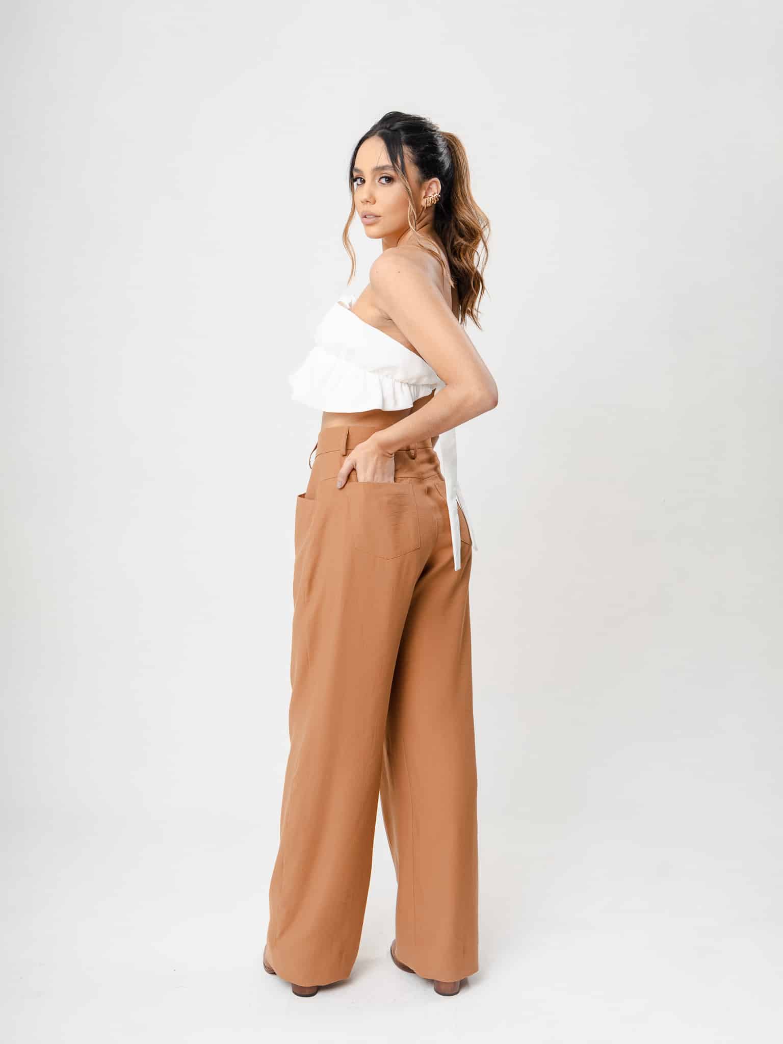 Calça wide leg com detalhe em recorte frontal com bolso embutido no recorte e bolso traseiro.