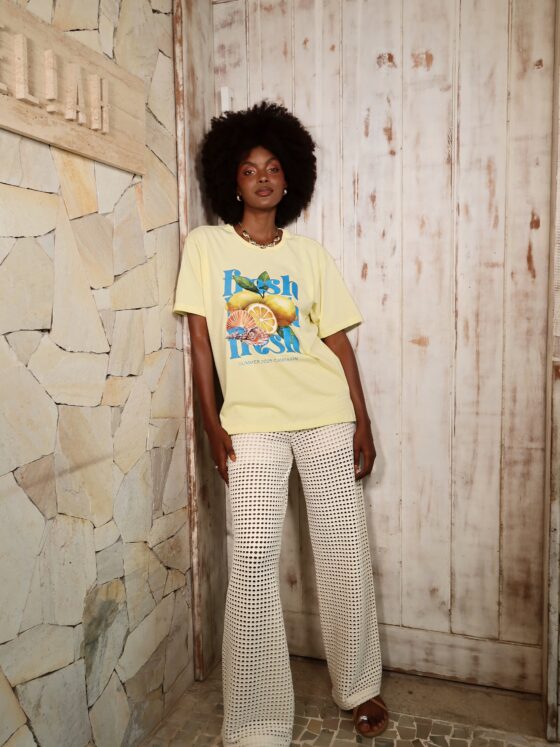 Detalhe: Calça modelagem pantalona em malha texturizada vazada. Possui forro na altura do quadril. Cós em elástico. Cadarço figurativo sem ajuste. Sem bolso.
