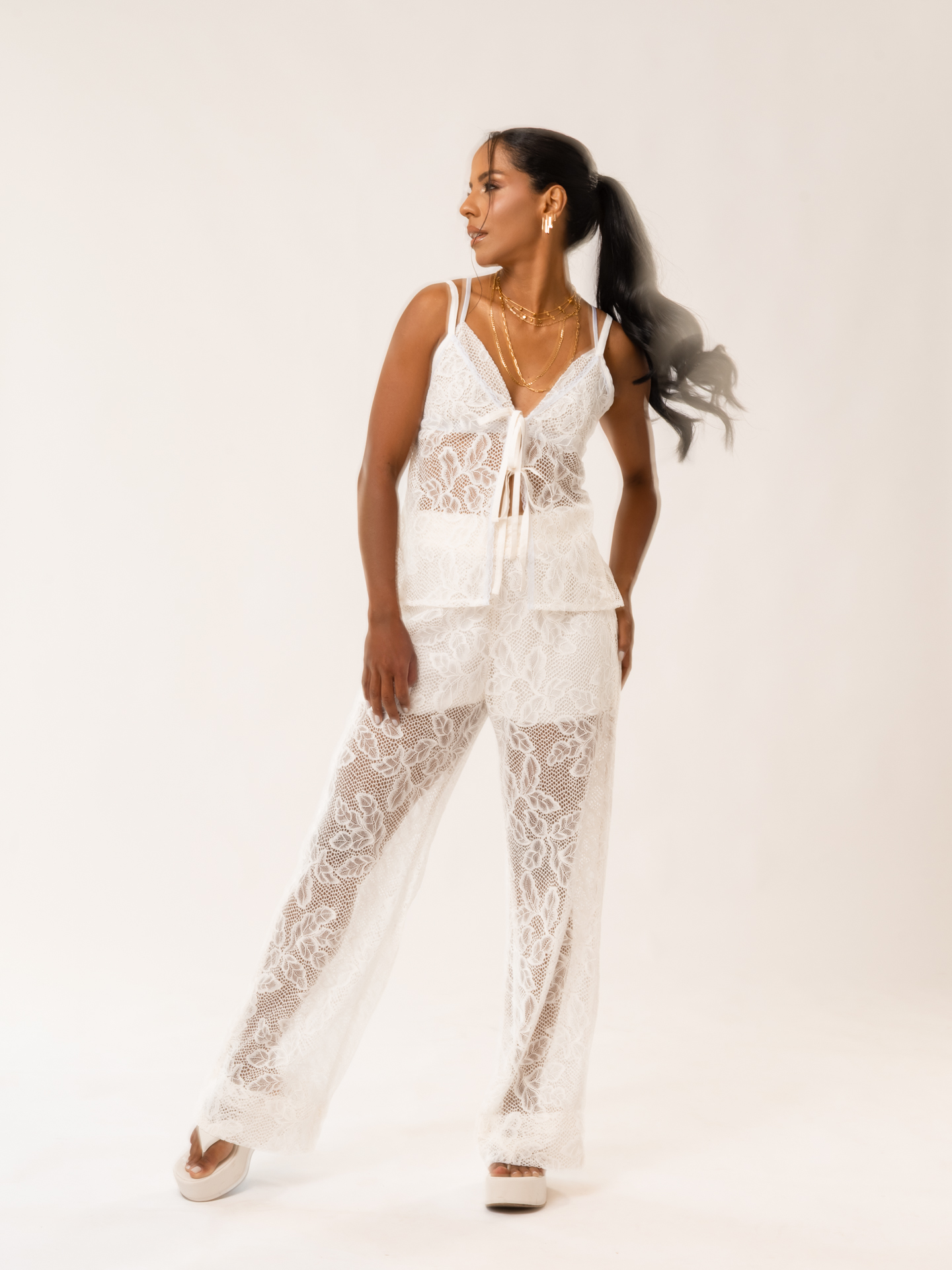 Detalhe: Calça modelagem pantalona em renda vazada. Possui forro na altura do quadril. Cós em elástico. Sem bolso.