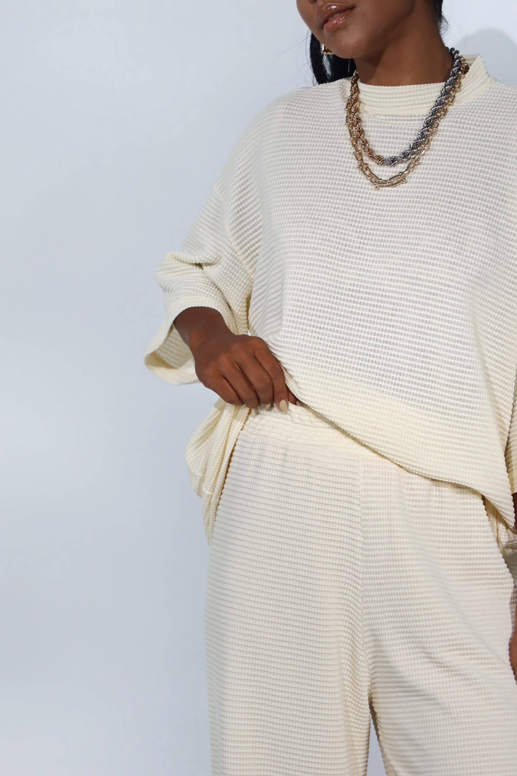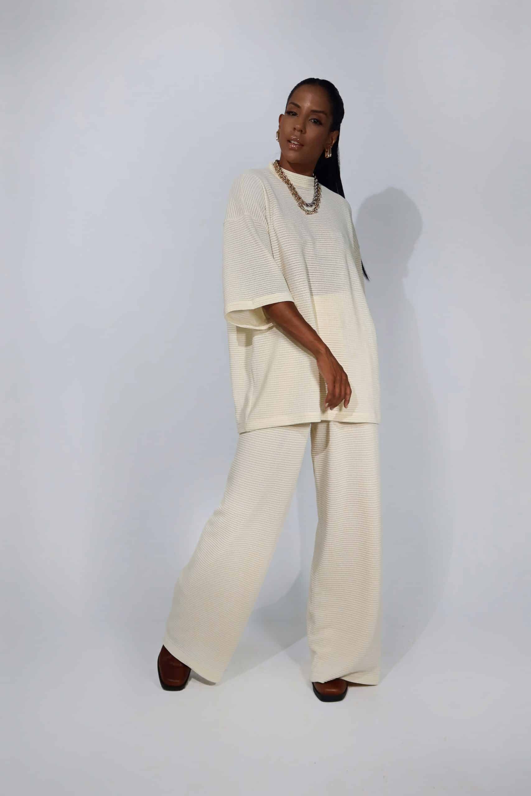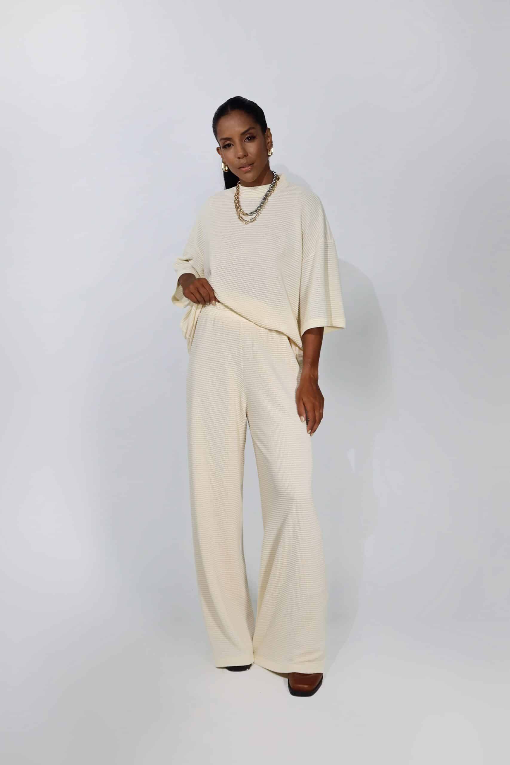 Calça ampla de malha texturizada com forro e cós em elástico.