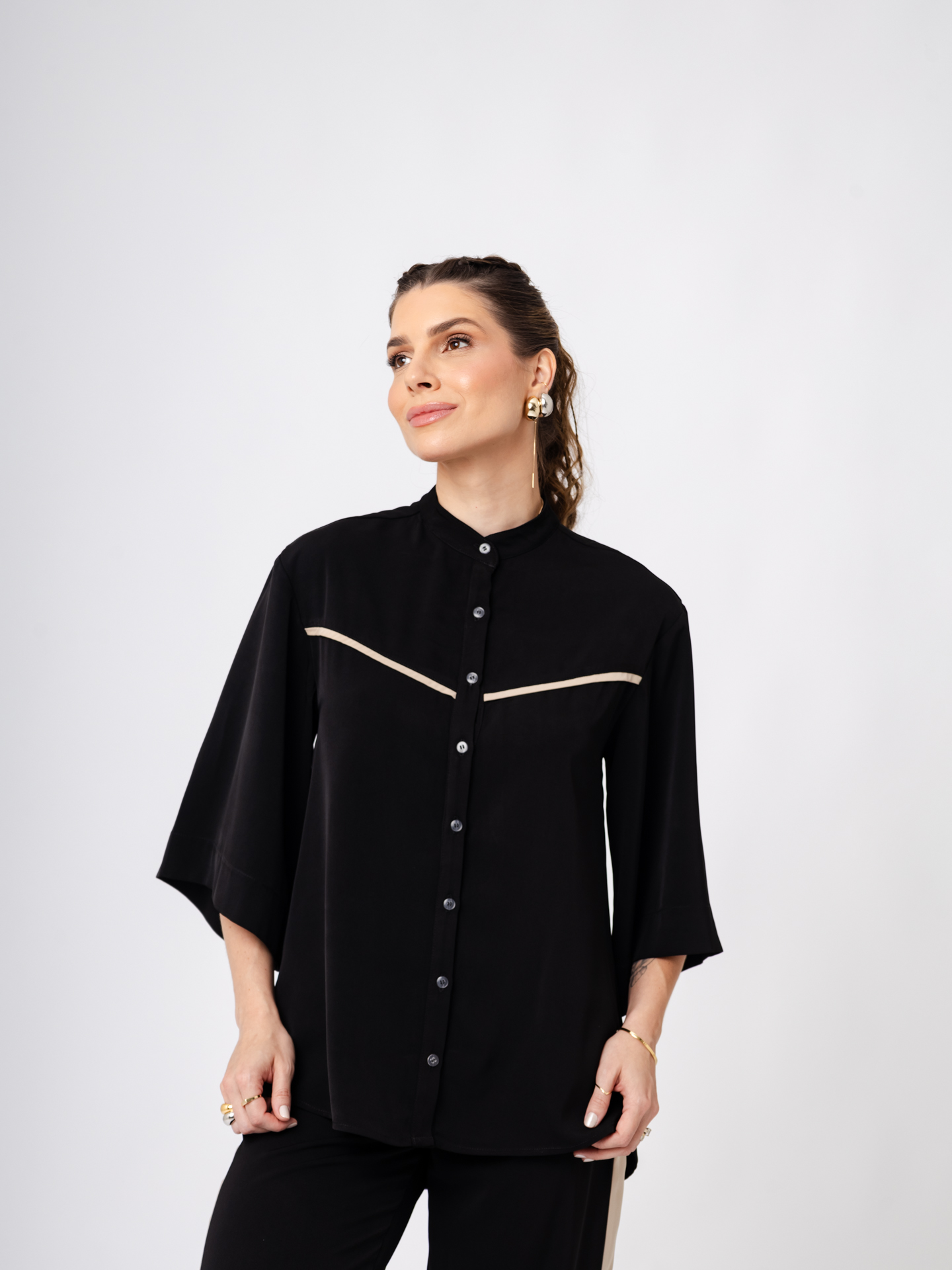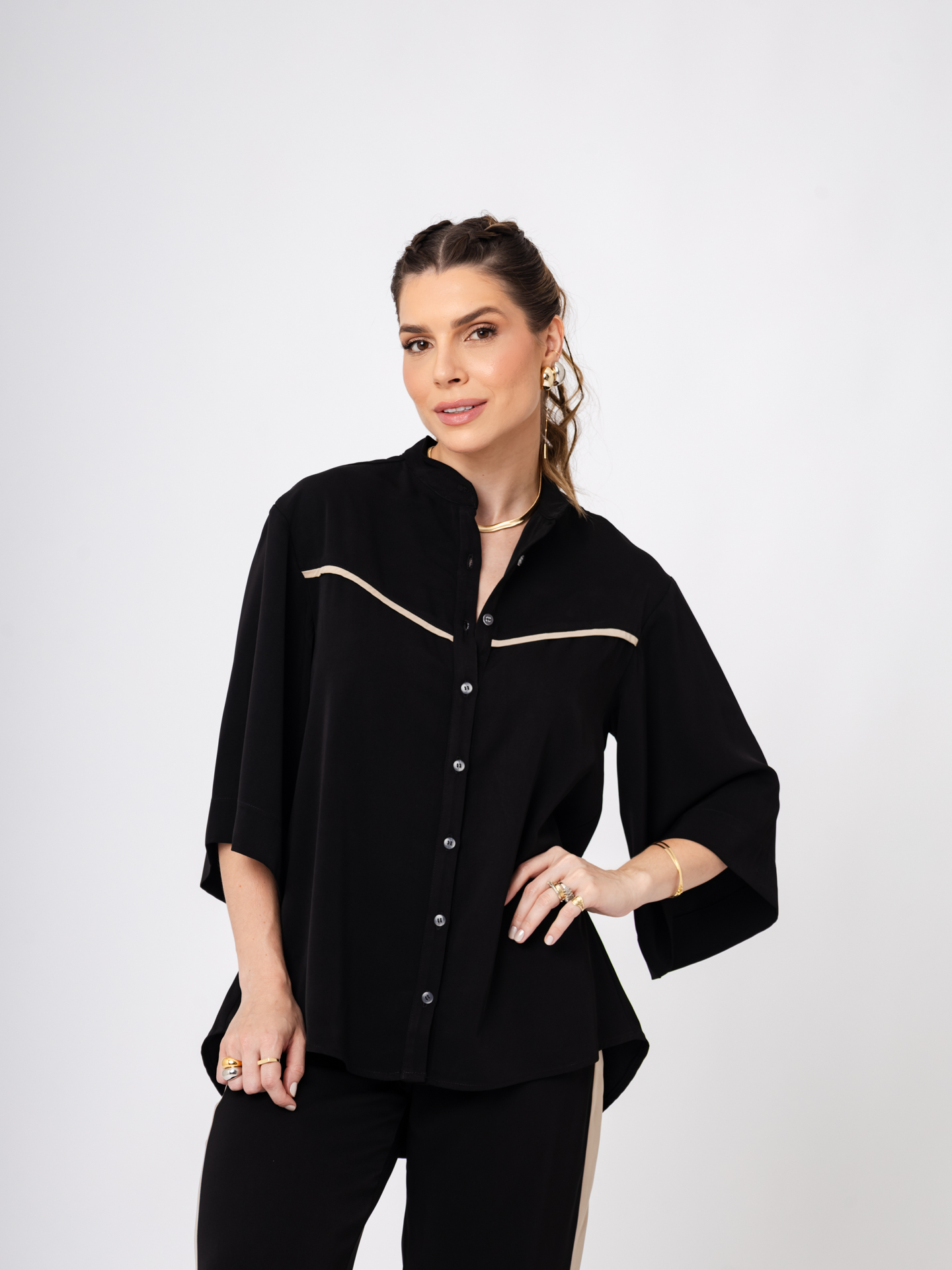 Detalhe: Camisa de botões com mangas na altura dos cotovelos. Tecido acetinado. Detalhe em viés na cor nude frontal.