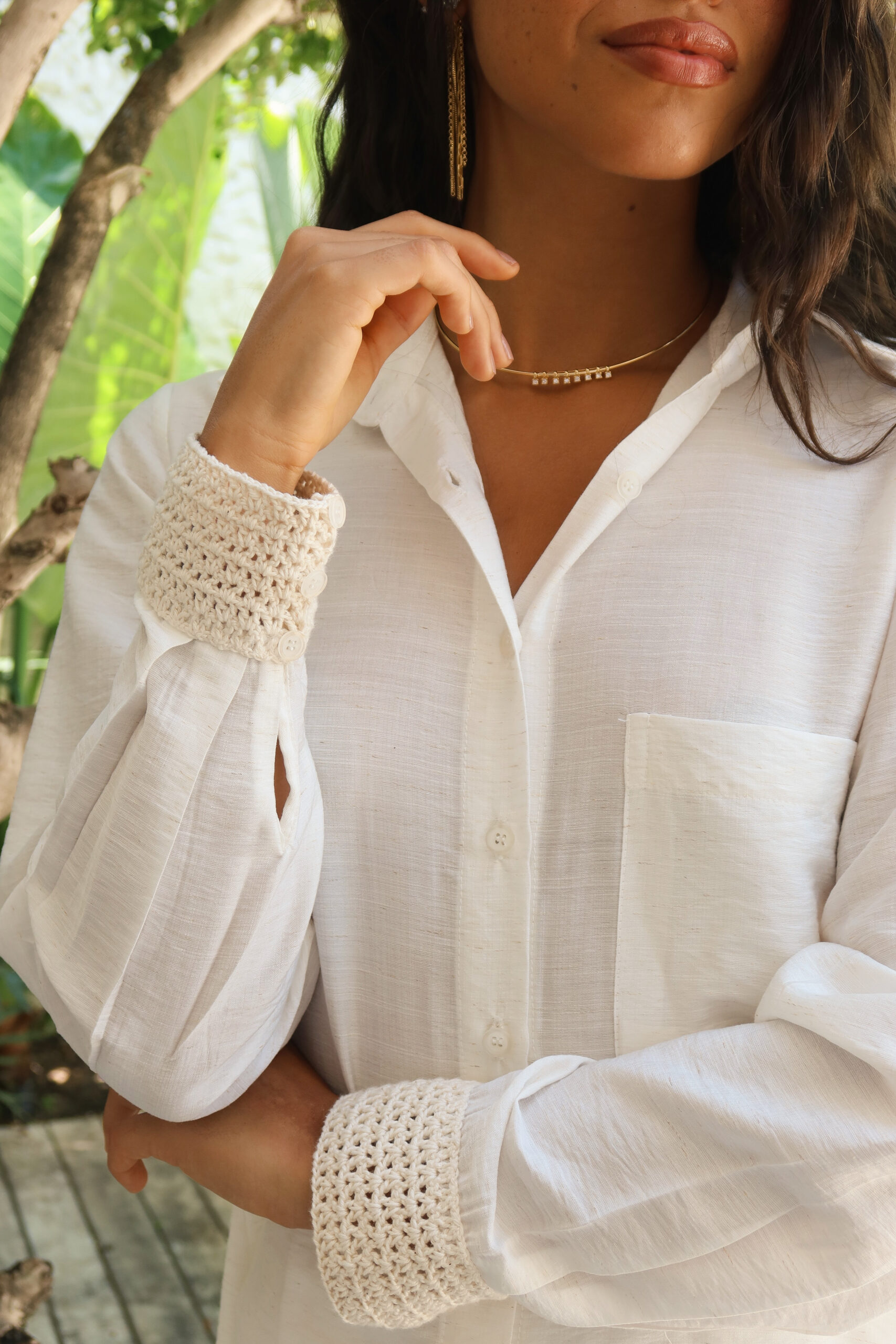 Detalhe: Camisa de botões e manga cumprida. Punho em crochê.