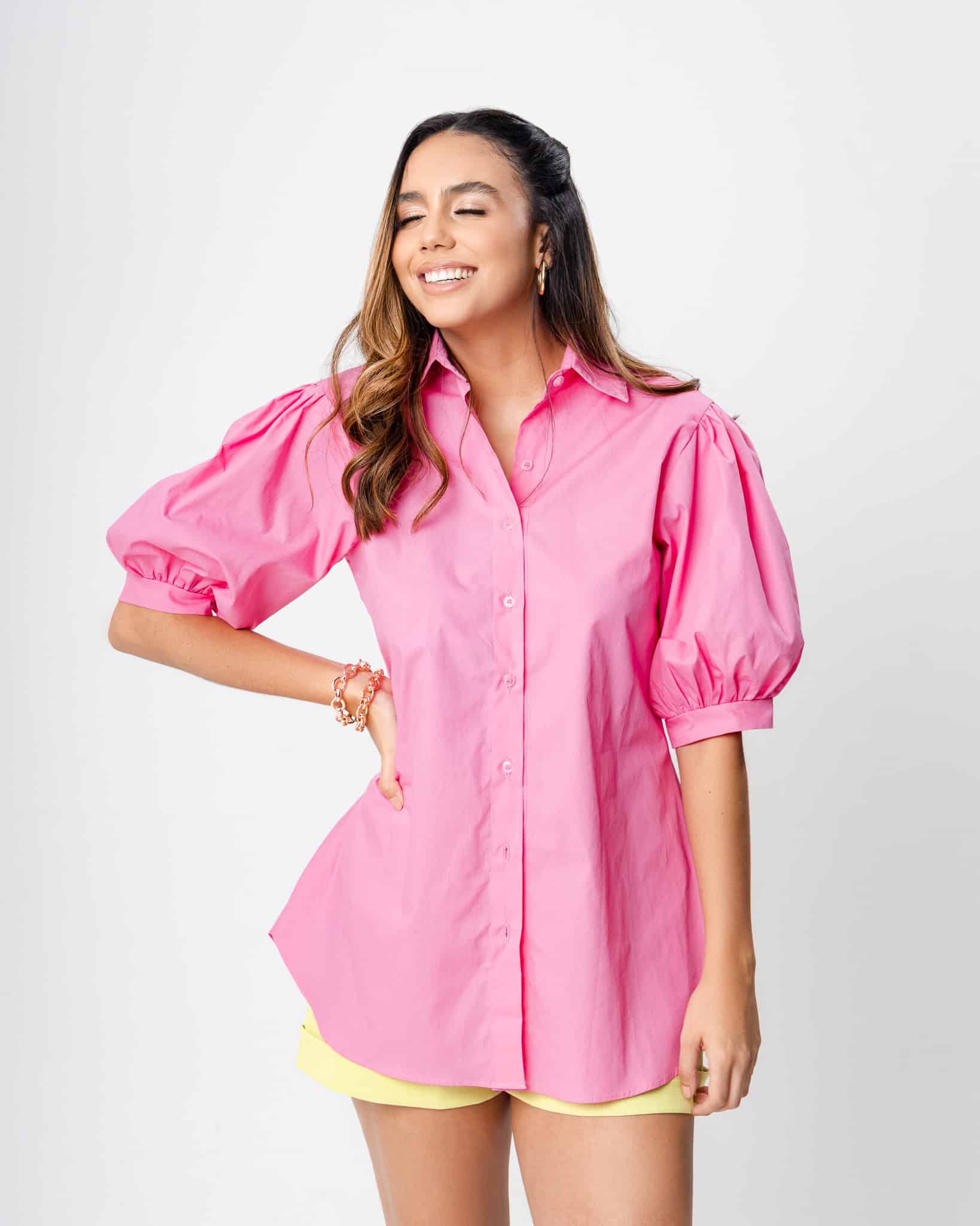 Camisa de botões em tricoline com manga bufante.
