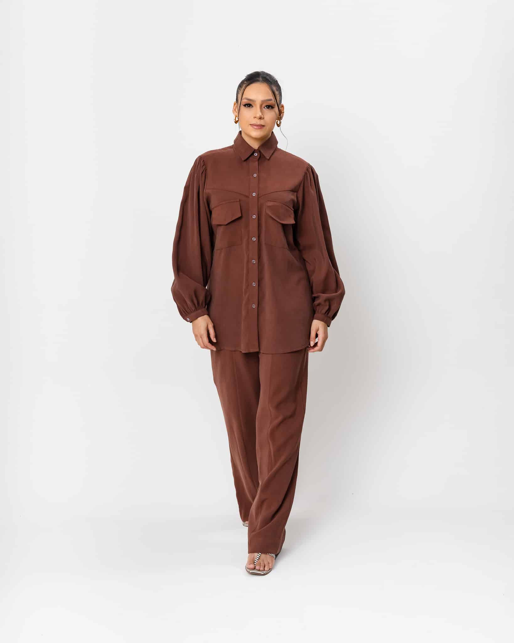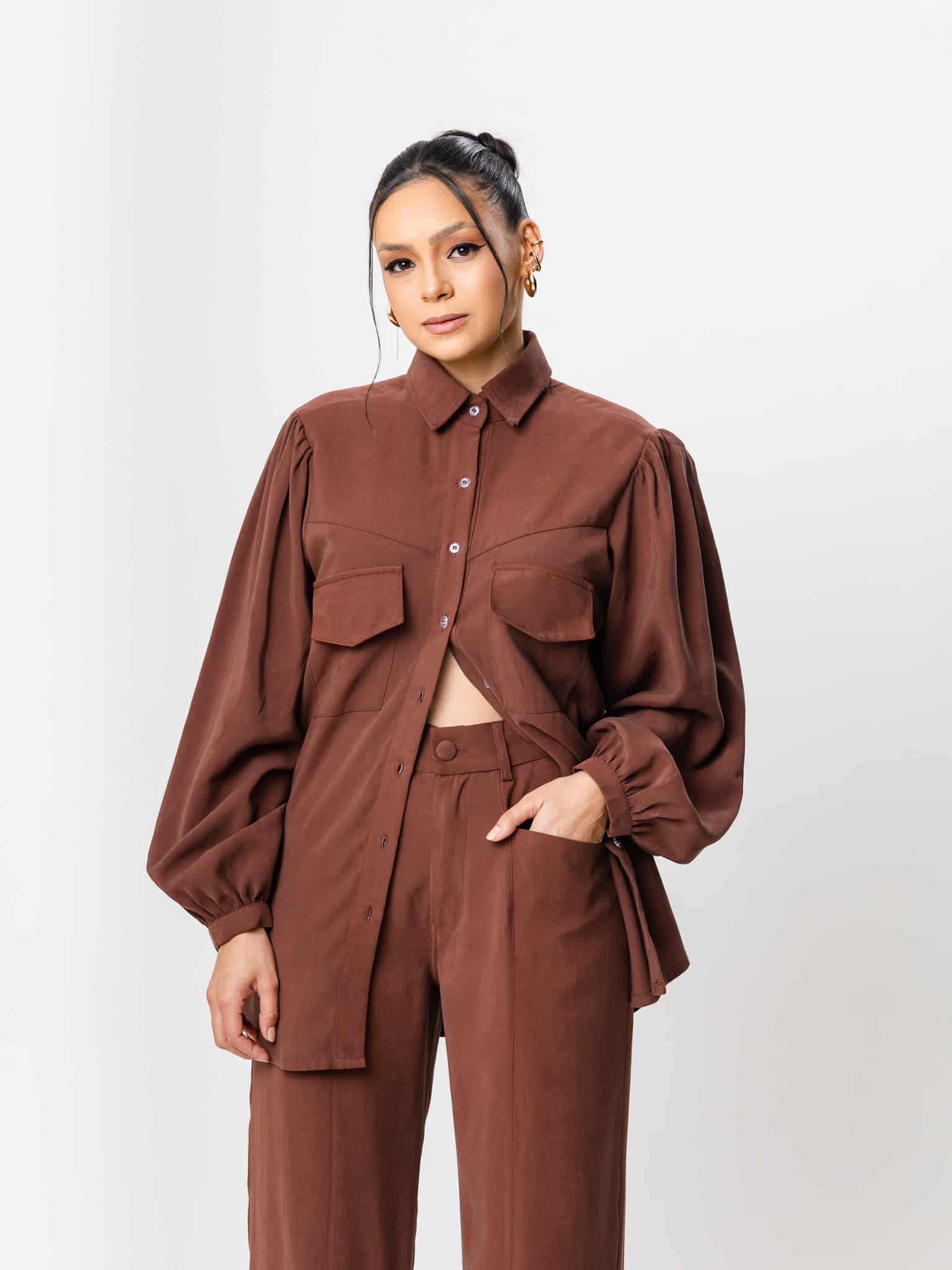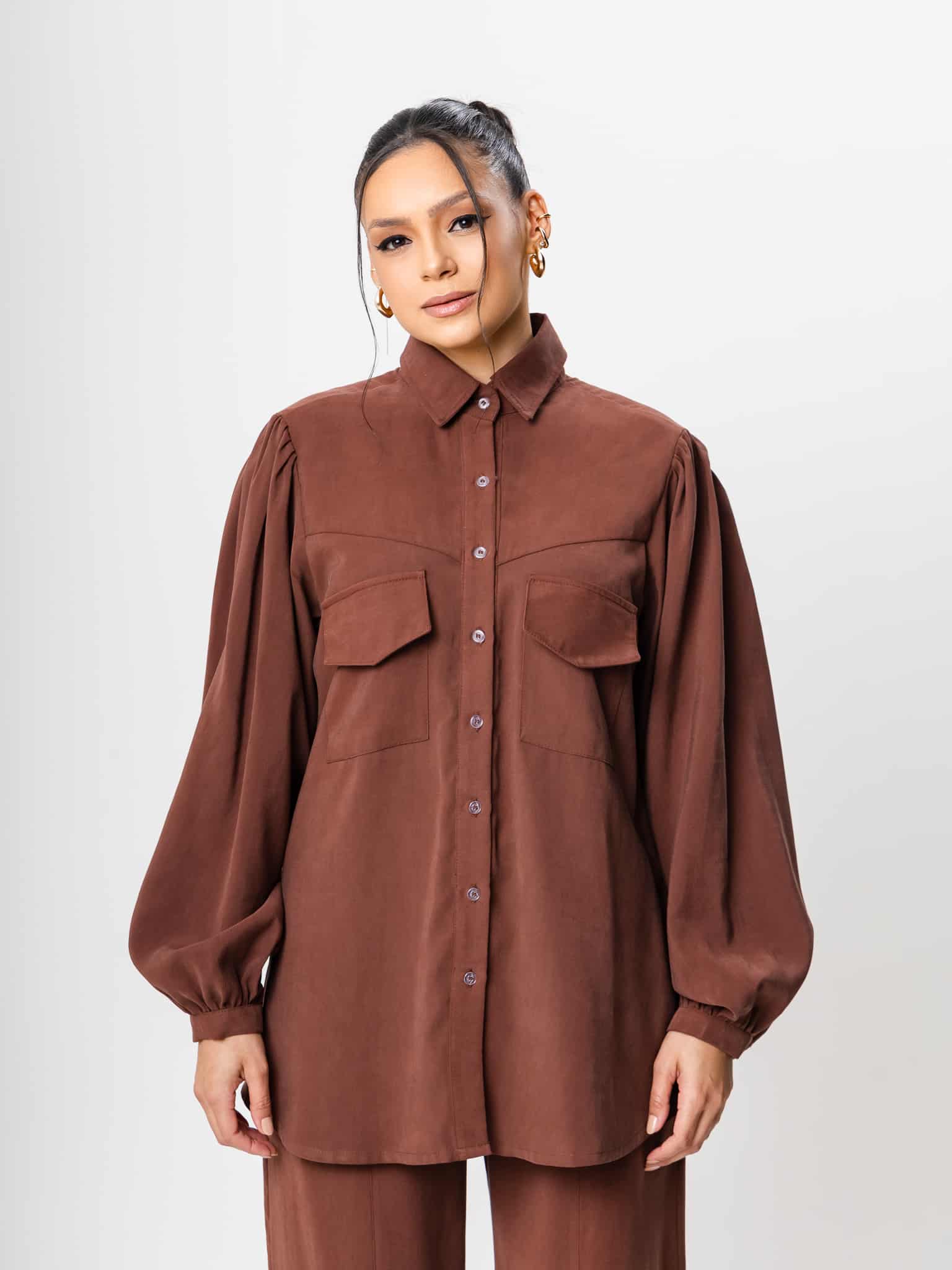 Camisa de botões ampla com manga comprida e bolsos frontais.