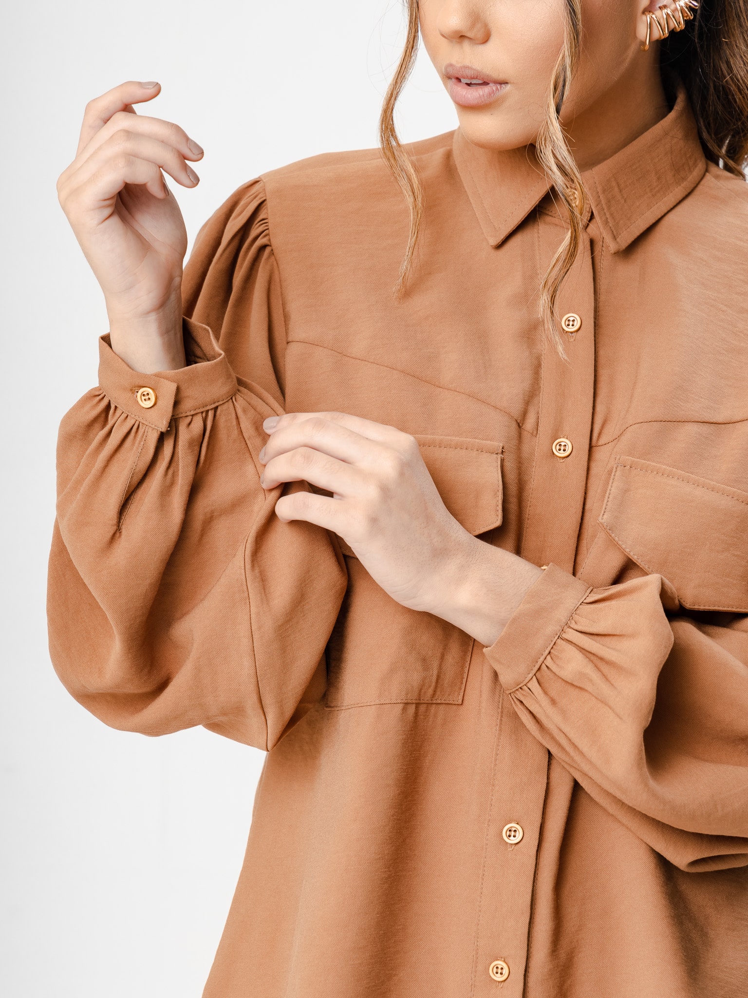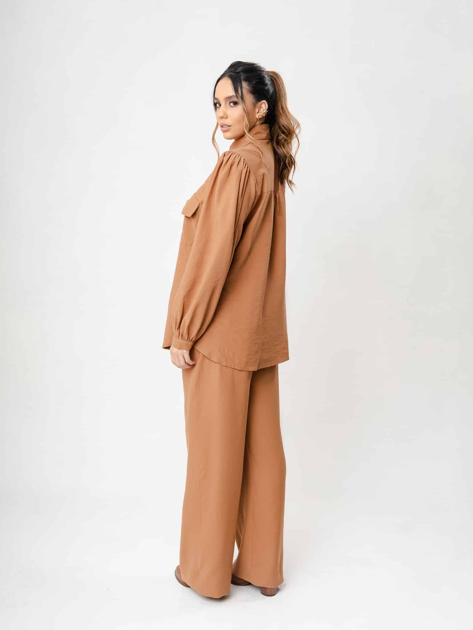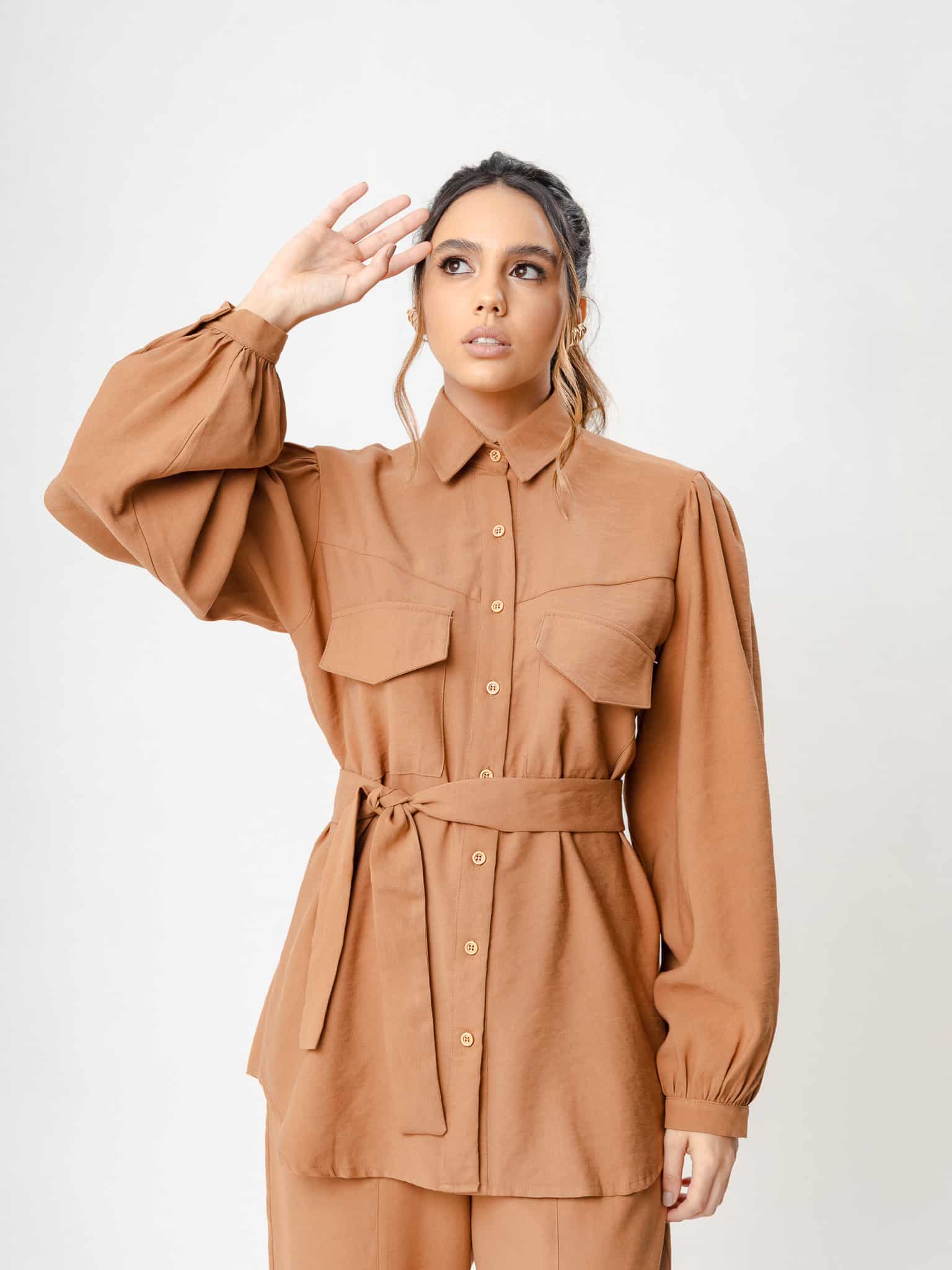 Maxi camisa em botões com recorte no busto e bolso com lapela. Acompanha faixa.