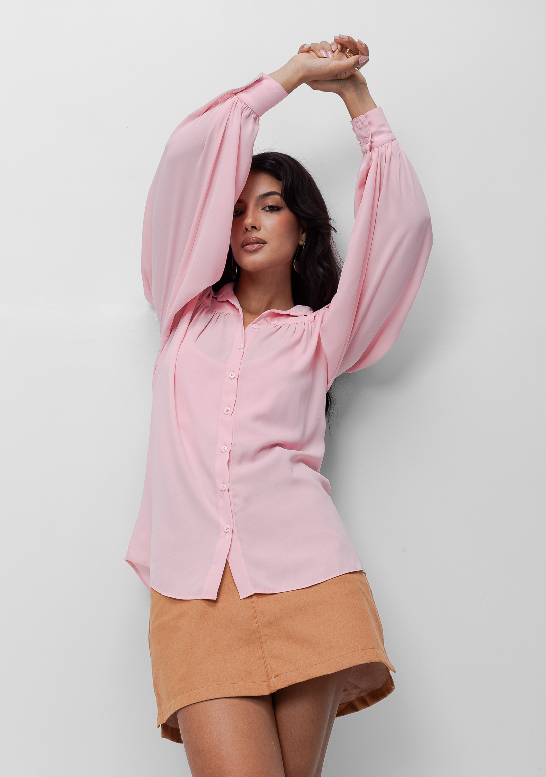Detalhe: Camisa de botões com mangas compridas. Punho entretelado com 4 botões. Tecido com leve transparência. Acompanha blusa de alcinha em malha da mesma cor para ser usada por baixo.
