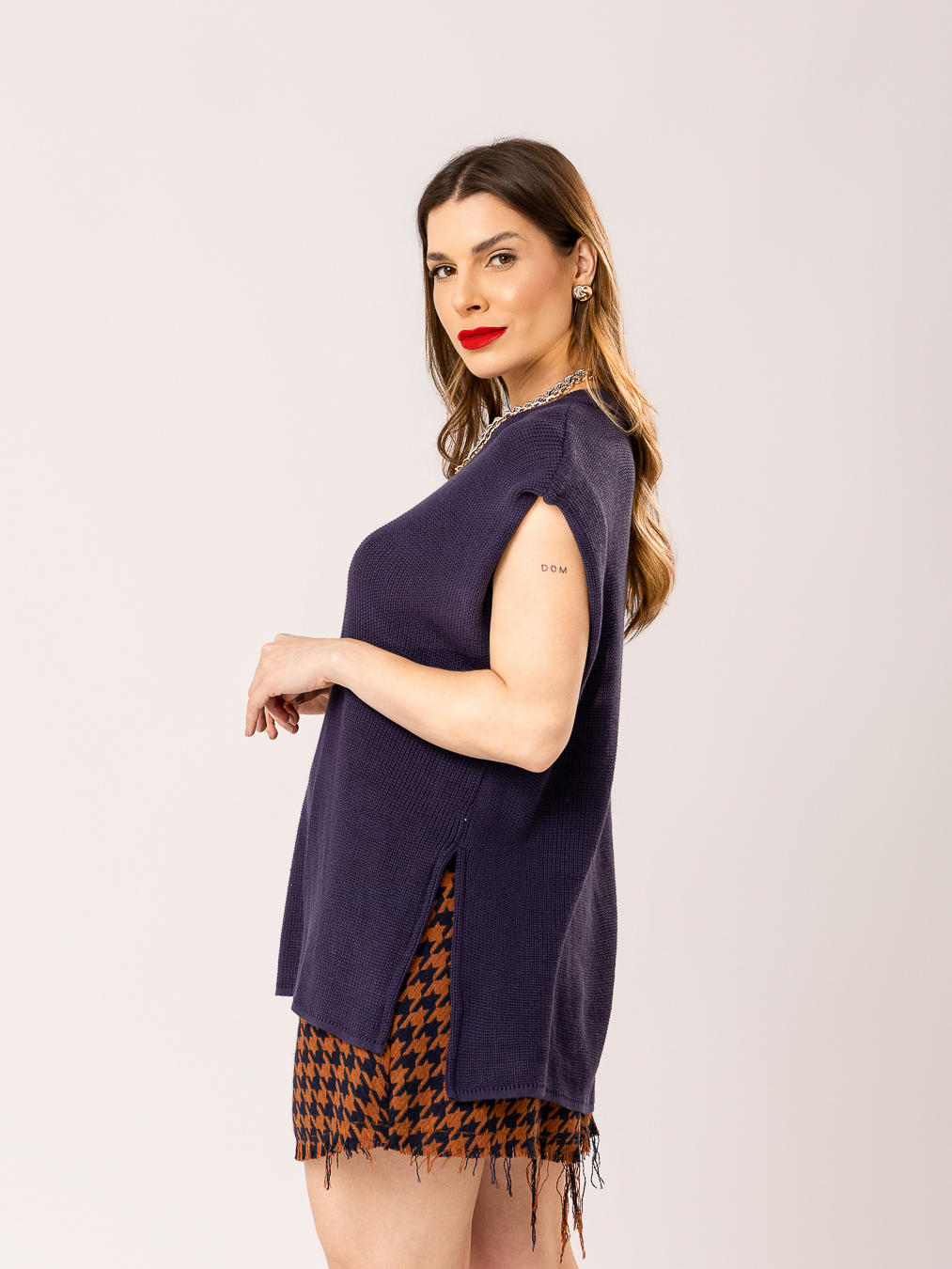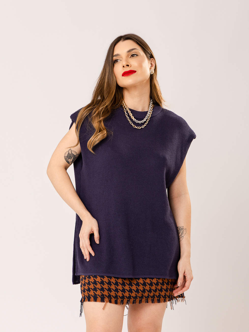 Detalhe: Blusa sem manga em tricot. Modelagem reta. Gola canoa bem próxima ao pescoço.