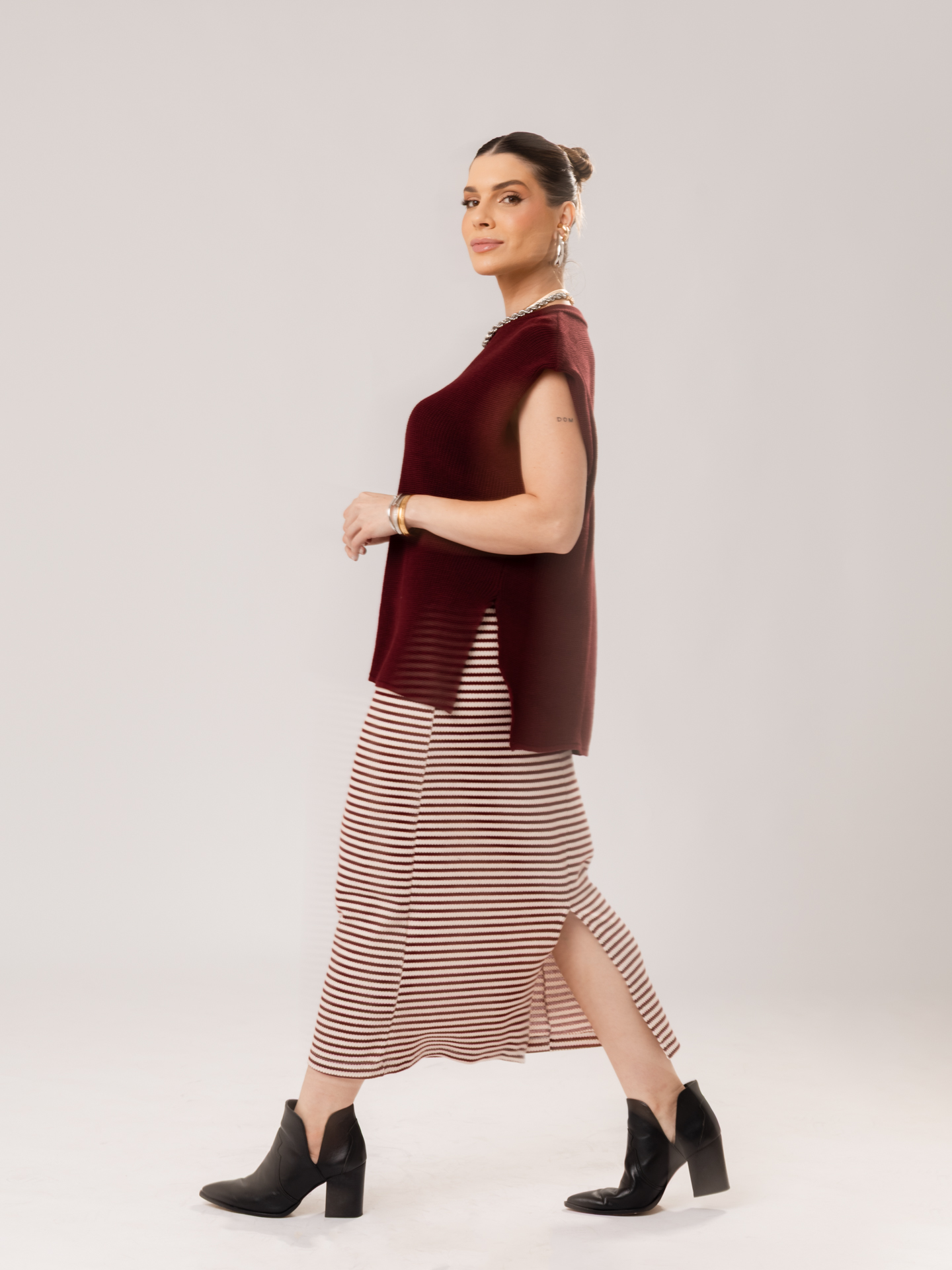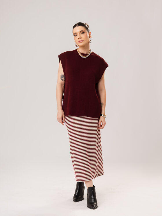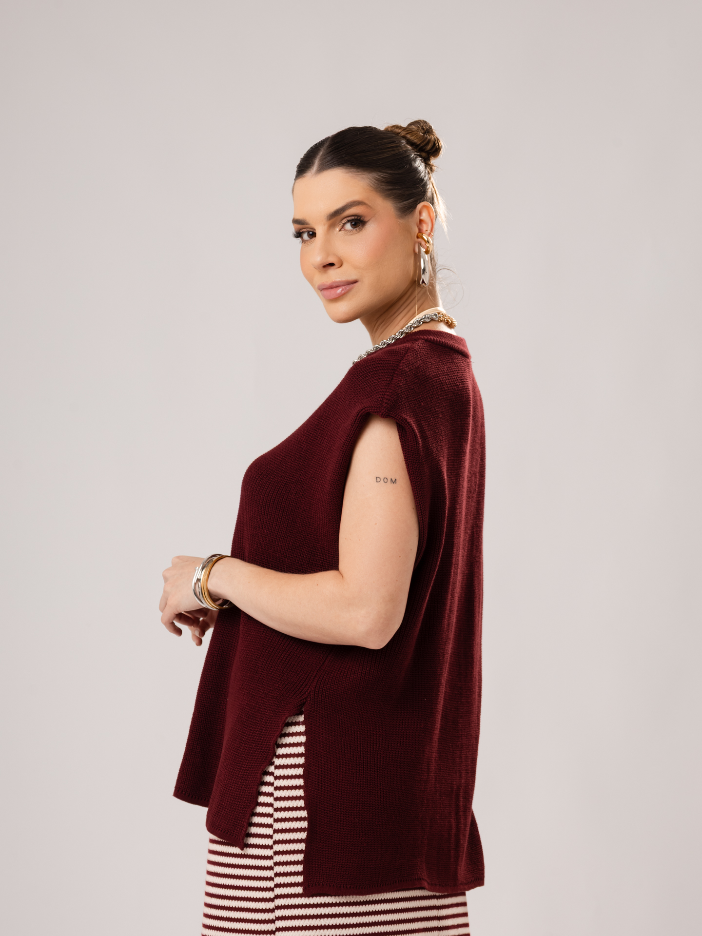 Detalhe: Blusa sem manga em tricot. Modelagem reta. Gola canoa bem próxima ao pescoço.