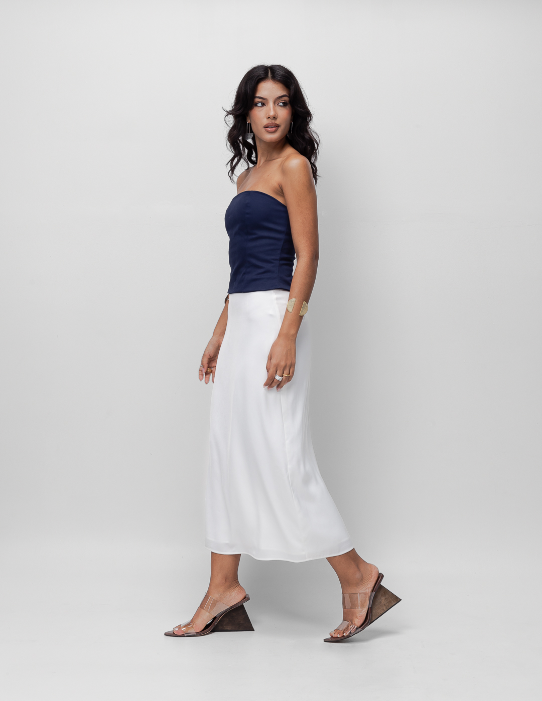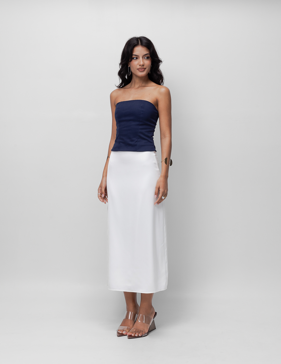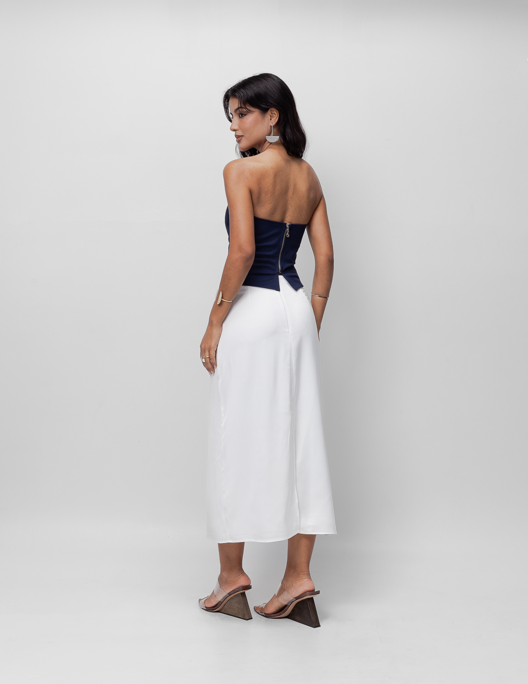 Detalhe: Blusa tomara que caia justa estilo corselet. Fechamento em zíper exposto traseiro.