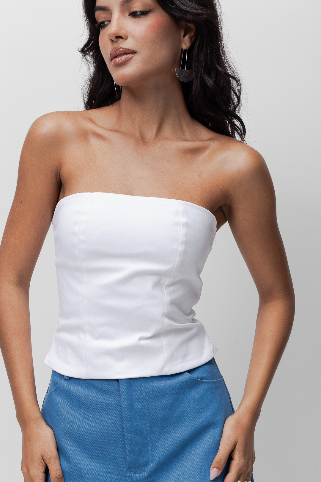 Detalhe: Blusa tomara que caia justa estilo corselet. Fechamento em zíper exposto traseiro.