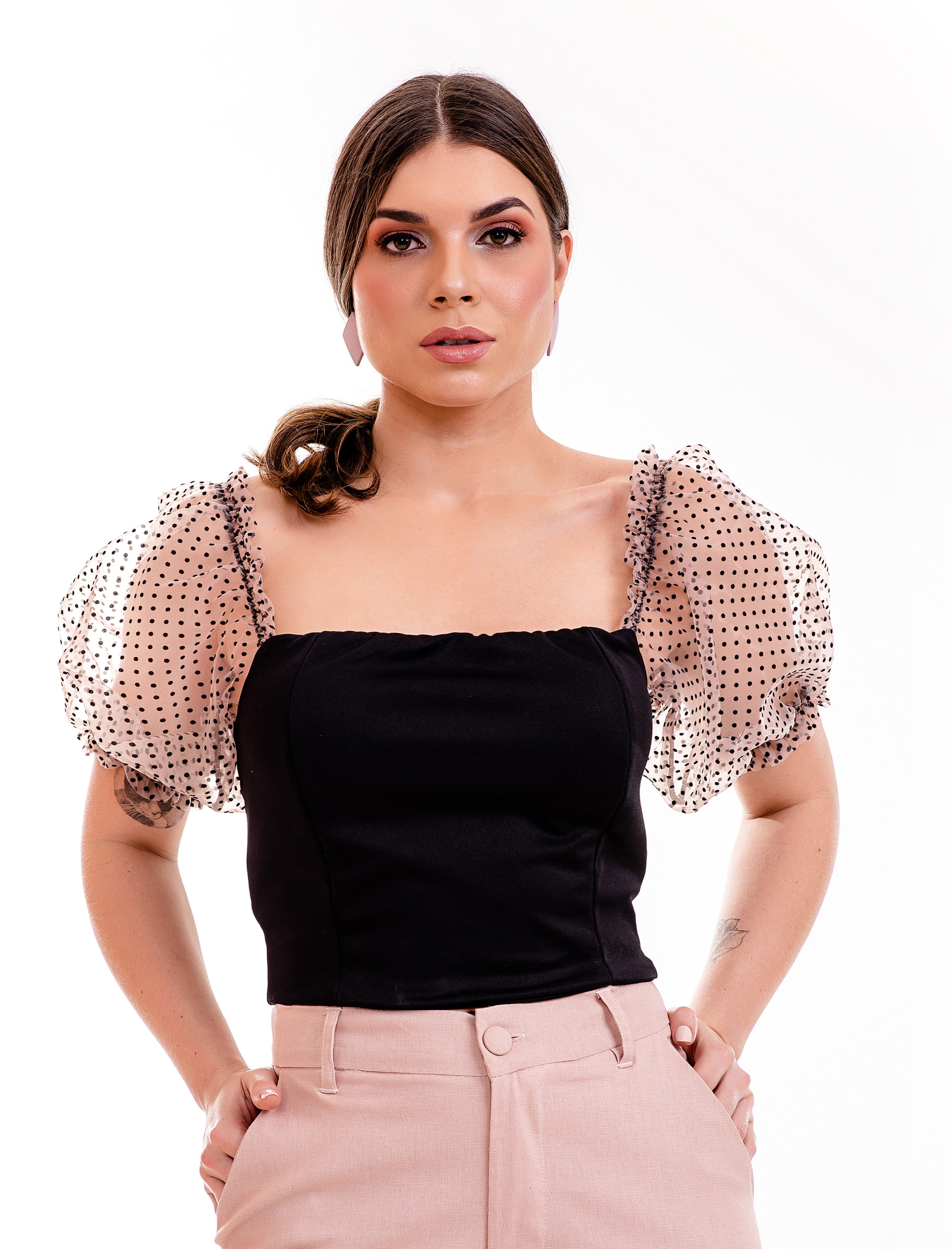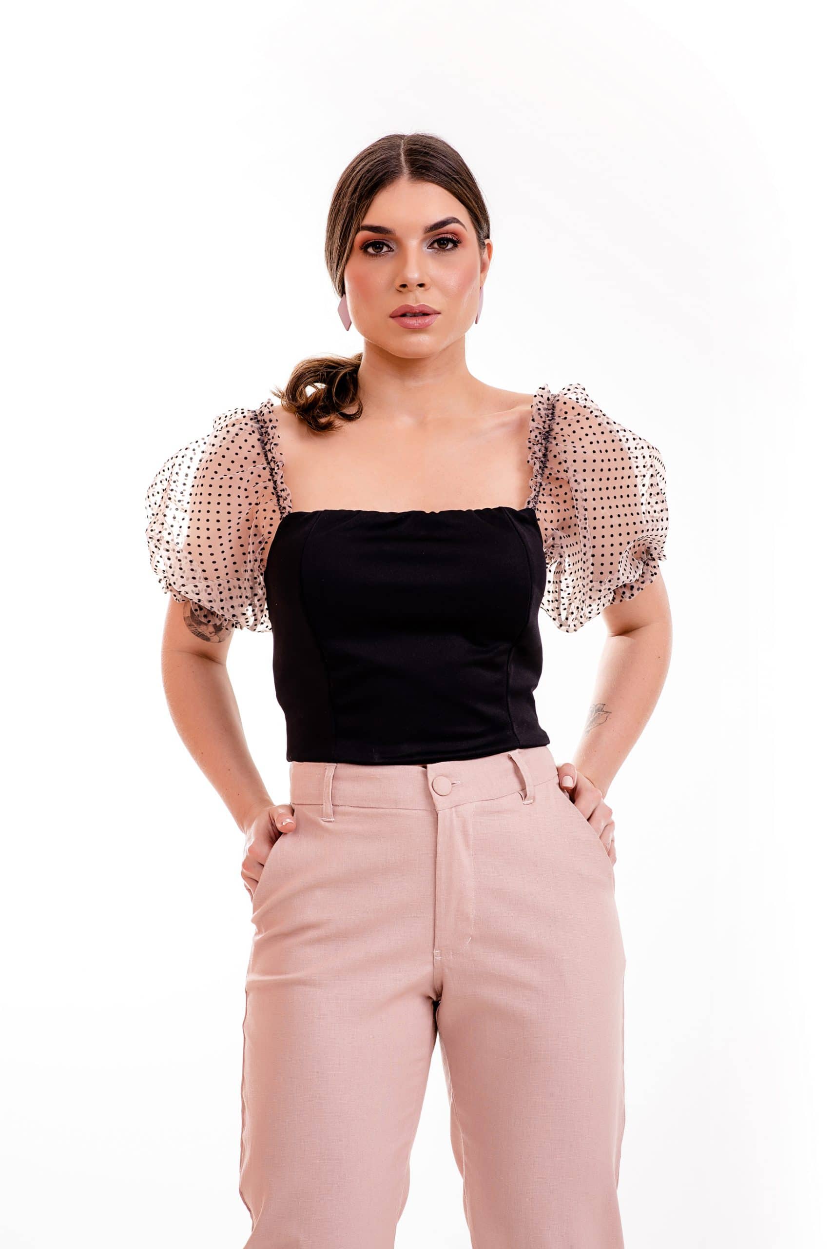 Busto: Composição 65% poliester, 35% algodão
