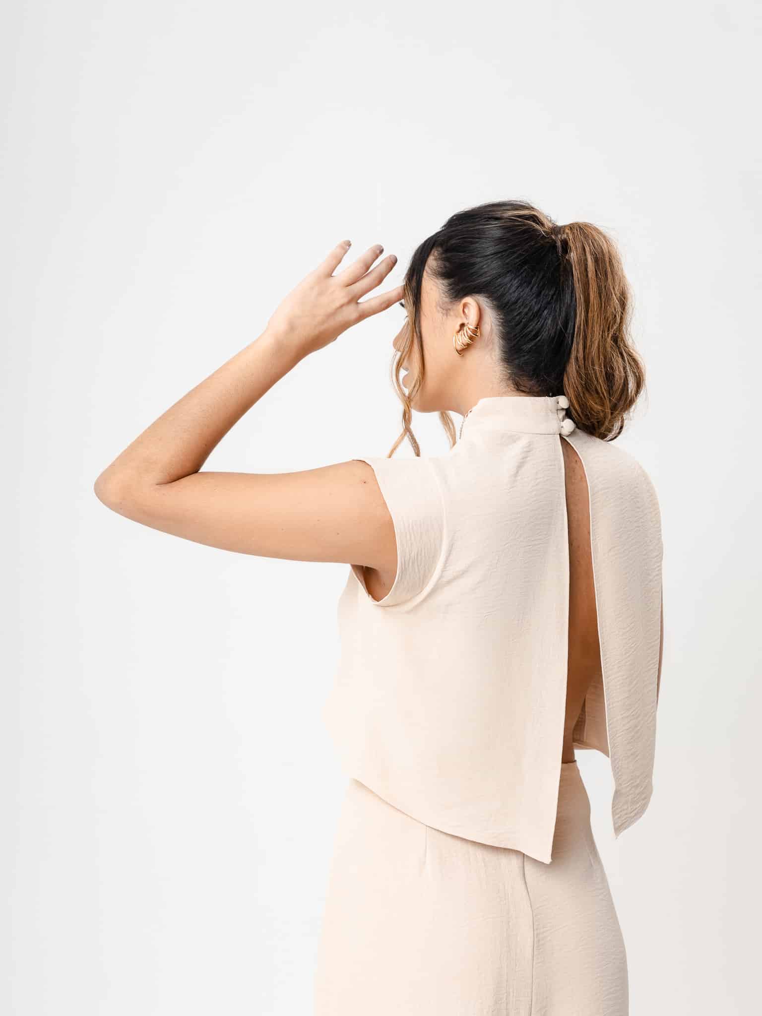 Cropped imponente com detalhe de ombros marcados. Fechamento em botões no pescoço. Costas aberta.