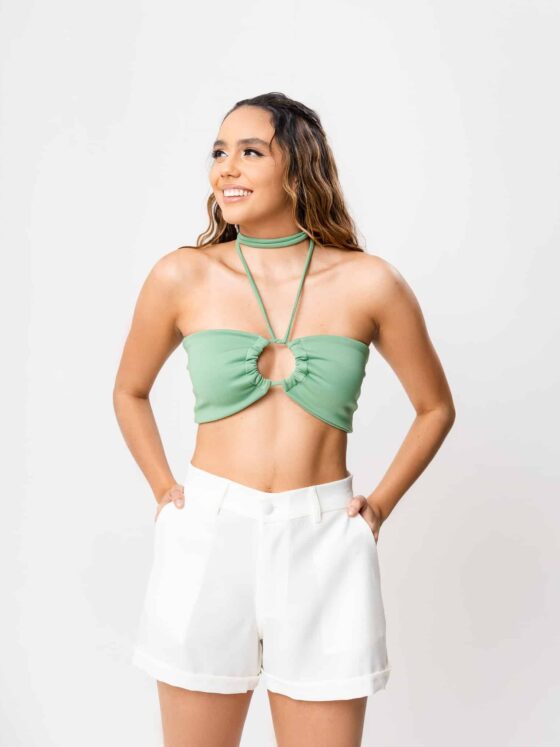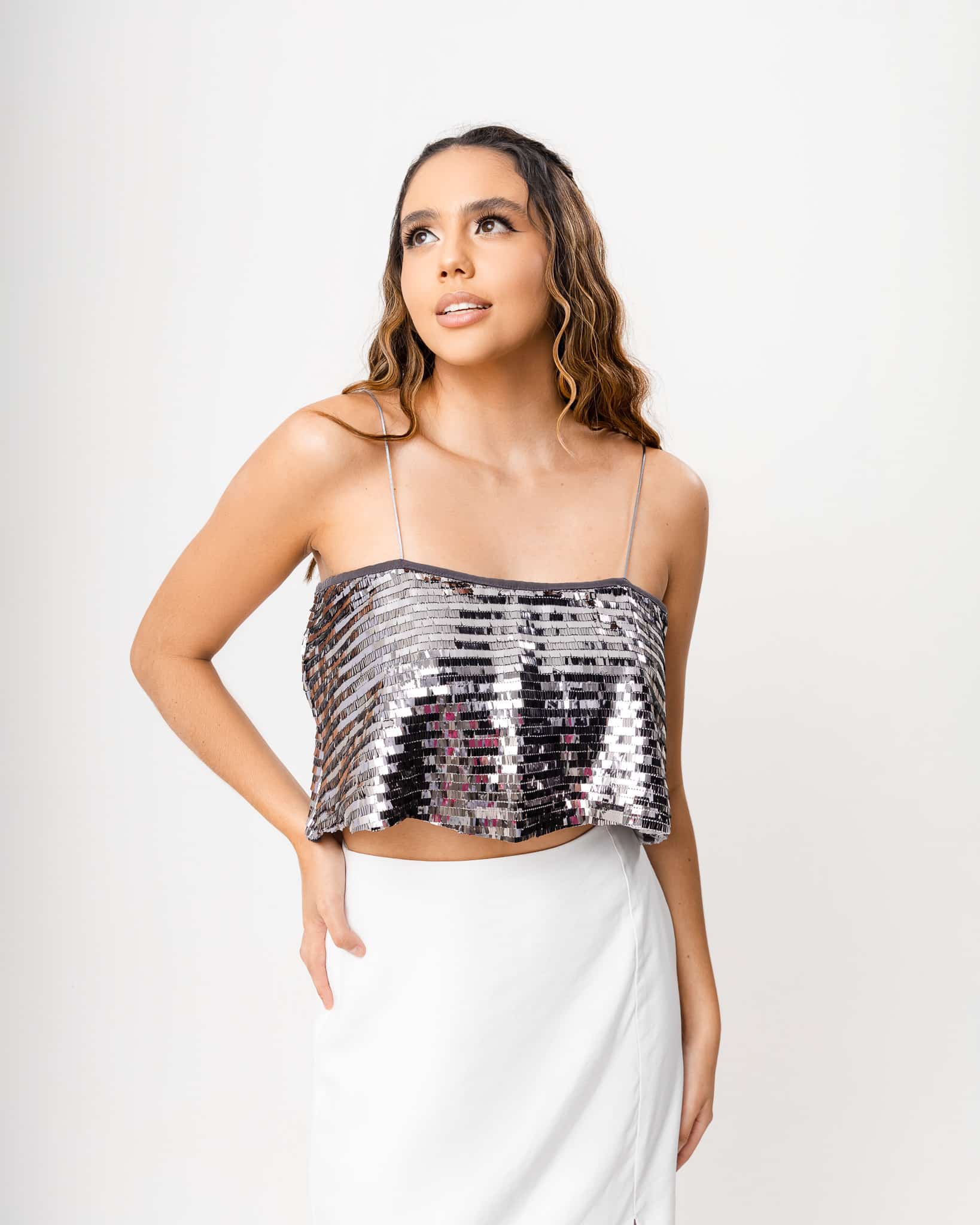 Cropped frente única em paetê, tamanho único com regulagem na amarração das costas.