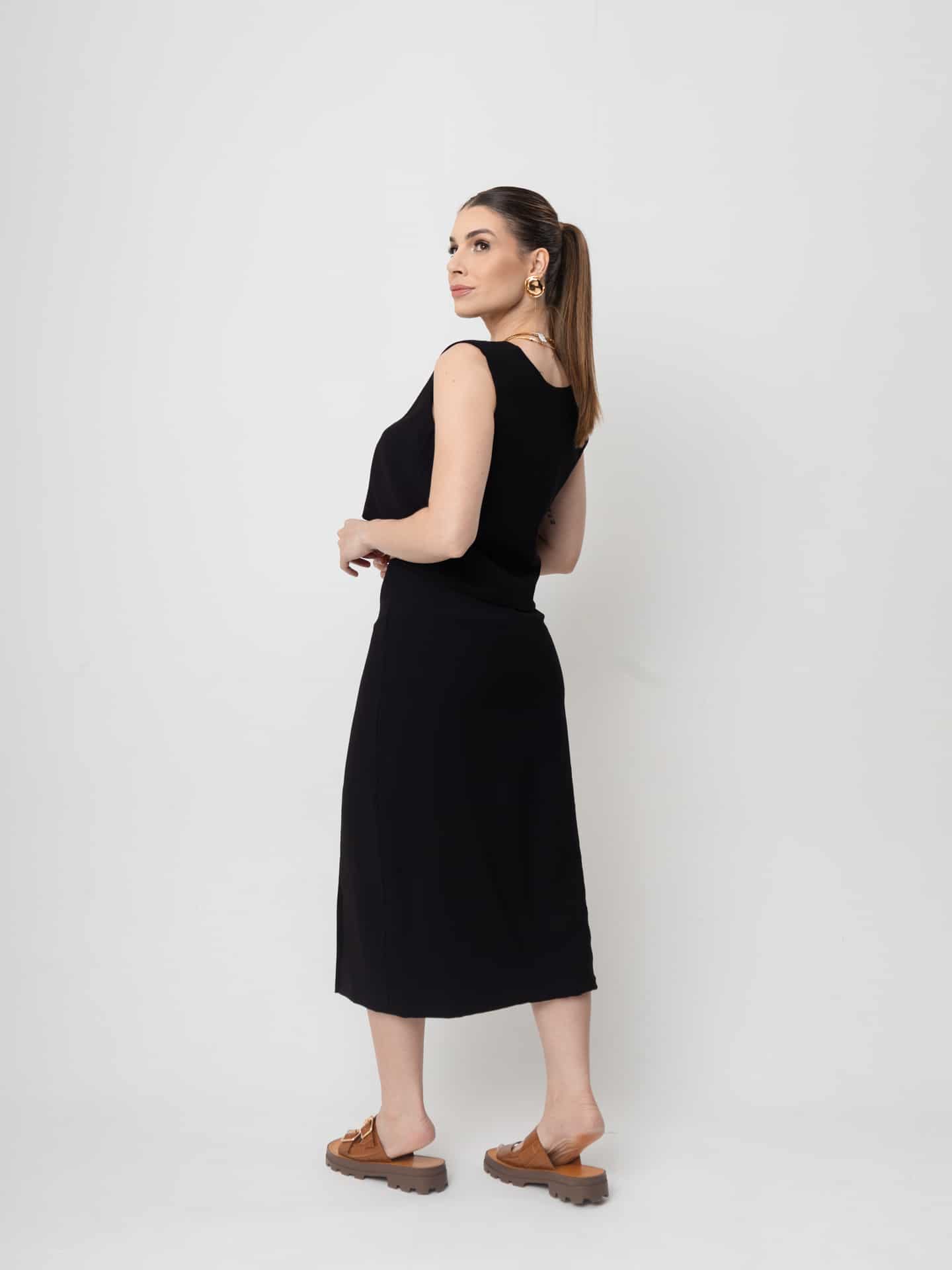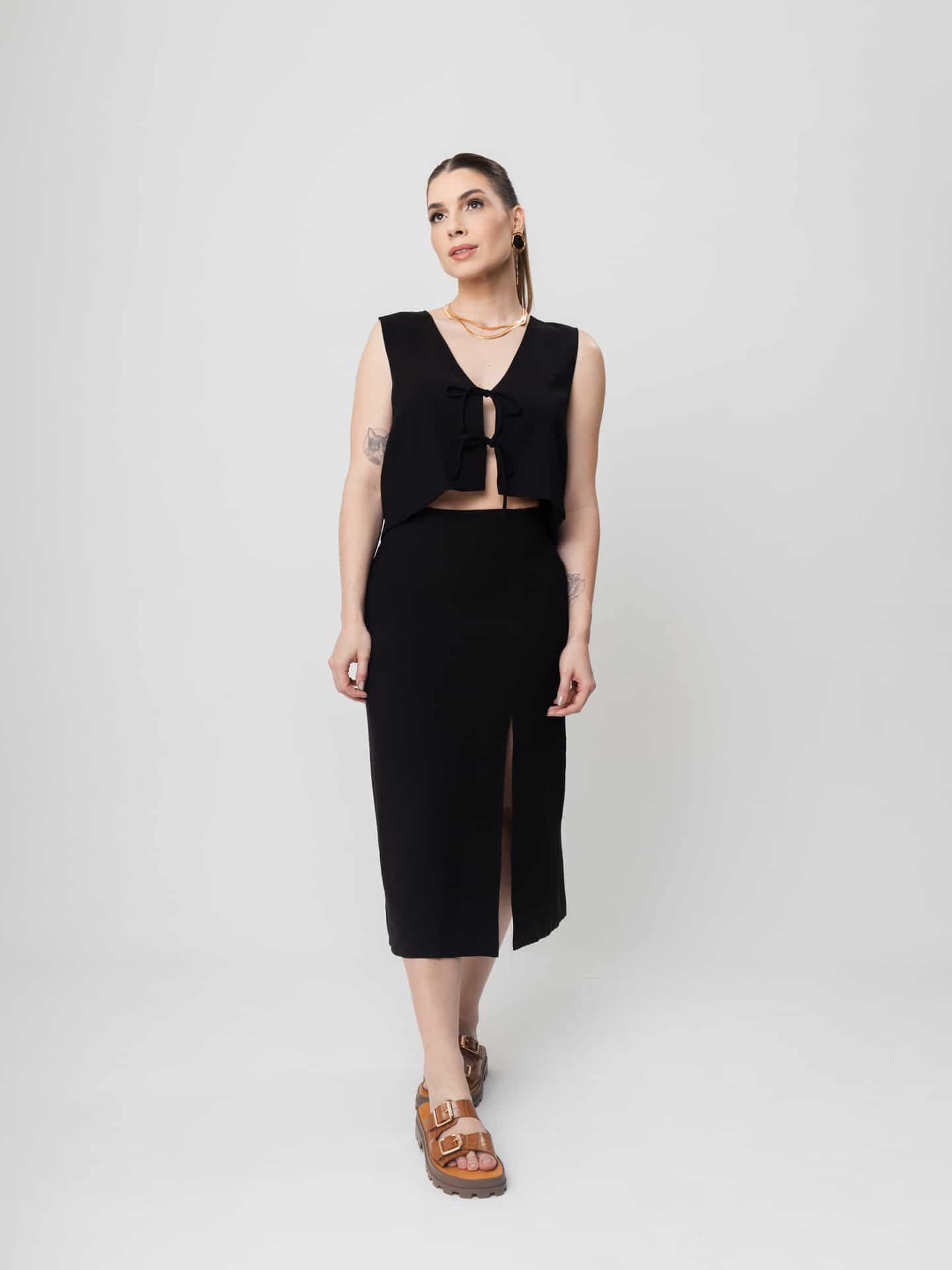 Saia midi com recorte frontal.