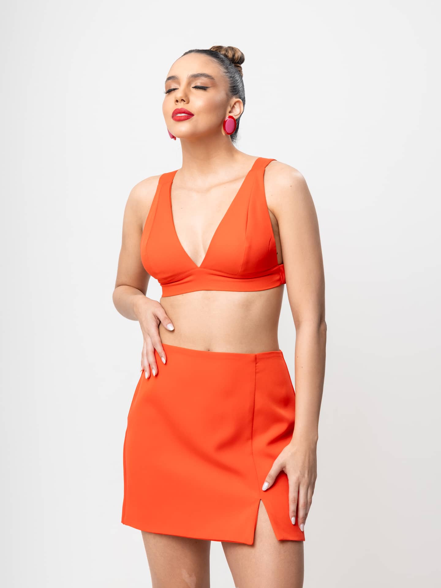 Saia com fenda frontal, dupla embutida com o próprio tecido. Fechamento em zíper traseiro.