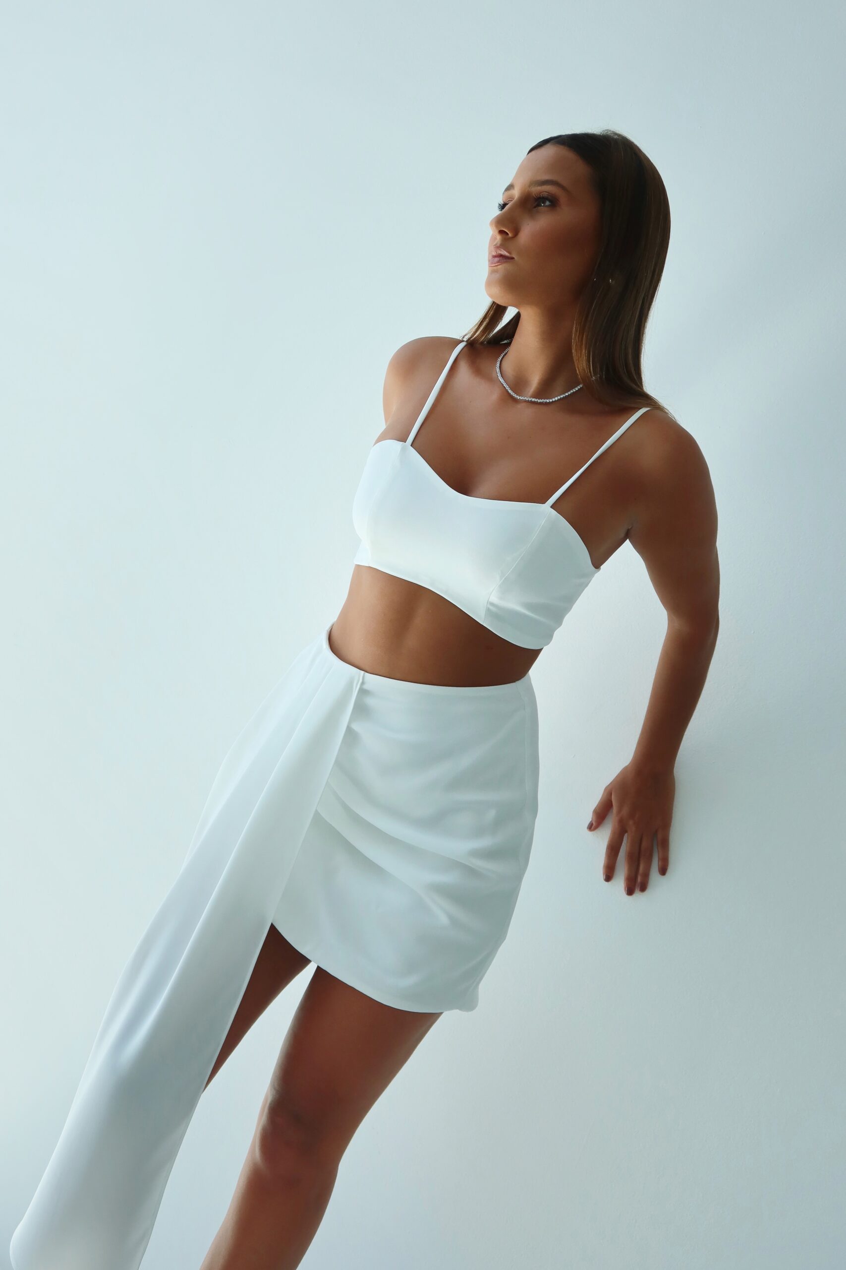 Detalhe: Saia curta com fechamento em ziper trazeiro.
