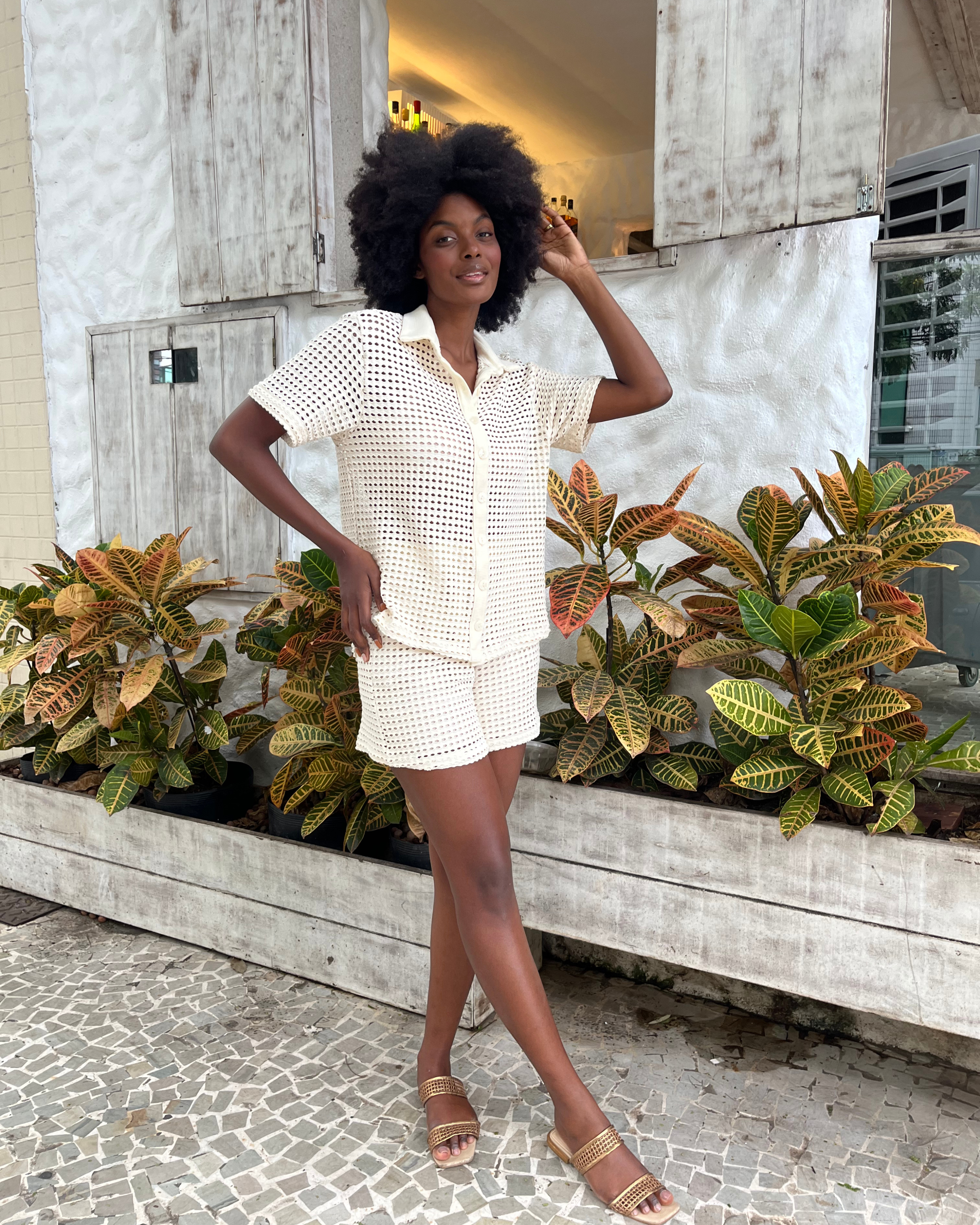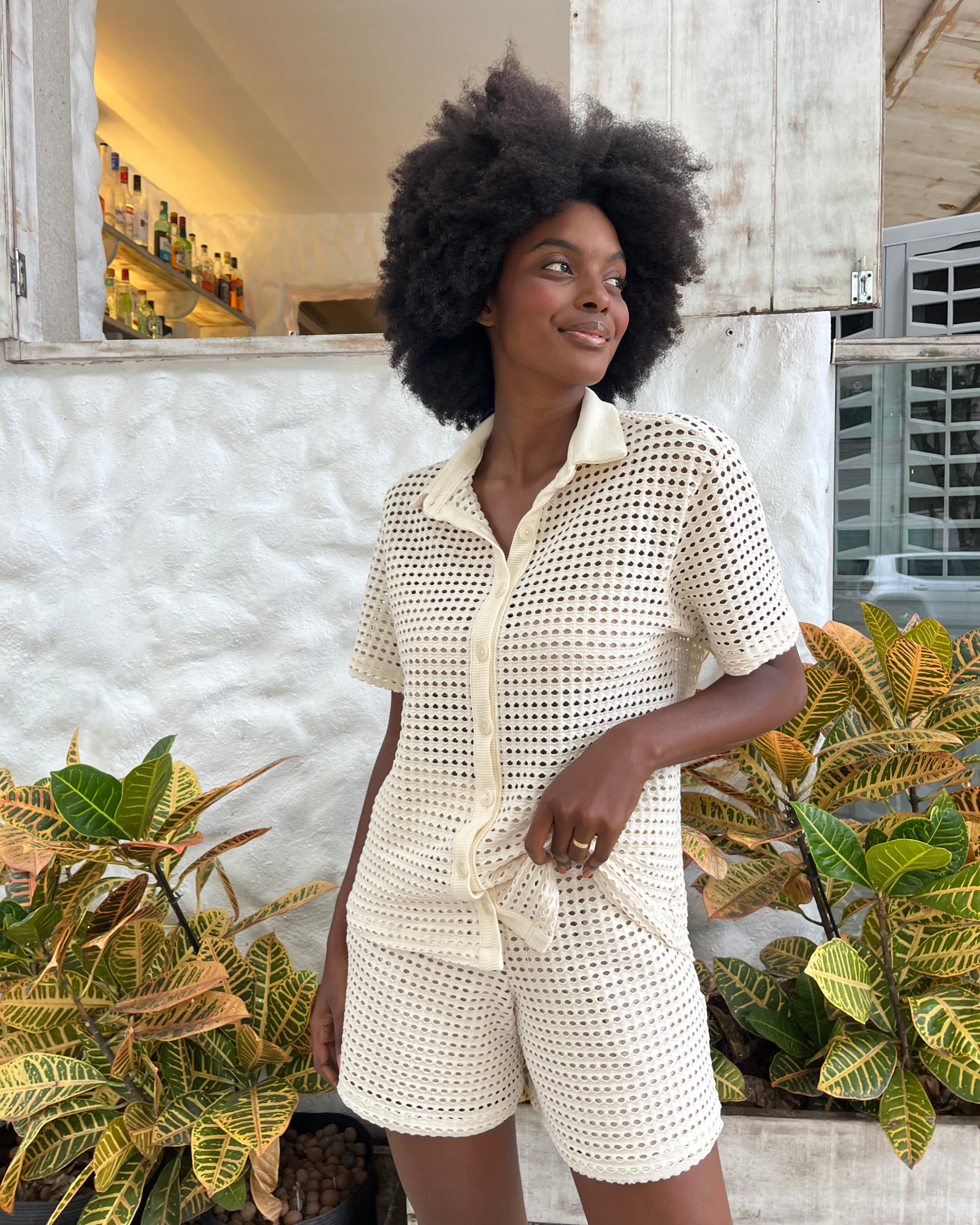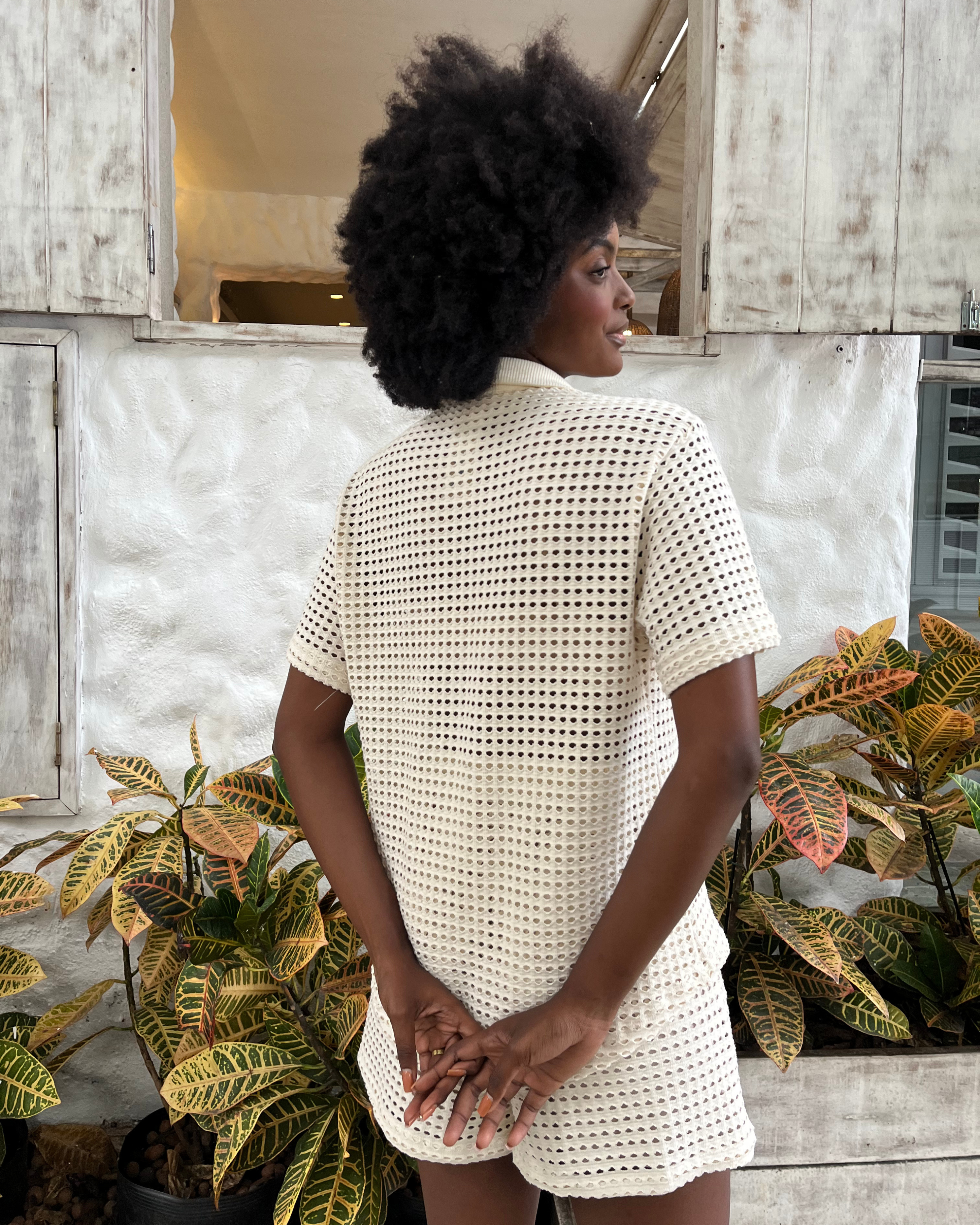 Tecido: Malha texturizada vazada.