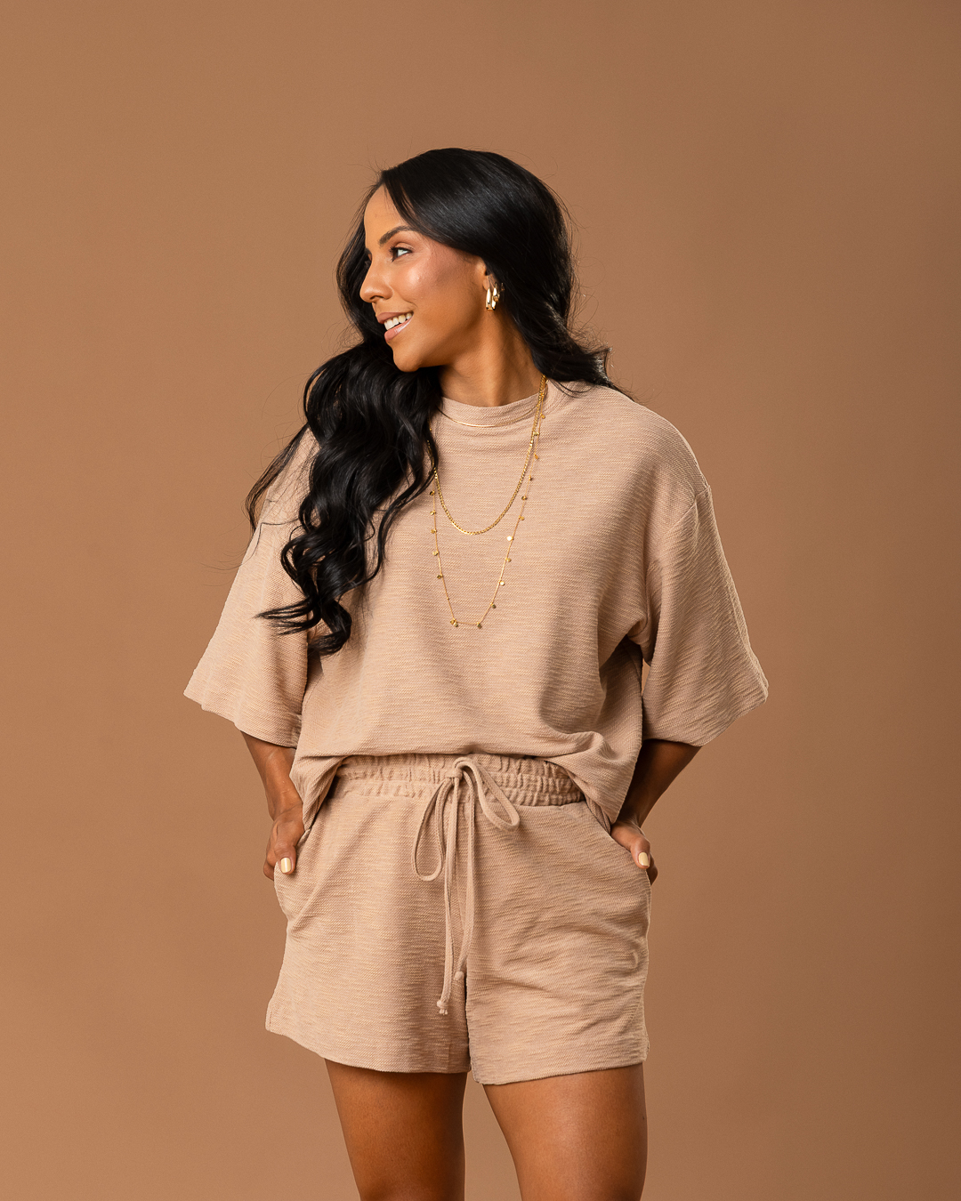 Detalhe: Short com cós em elástico. Com bolso faca lateral.