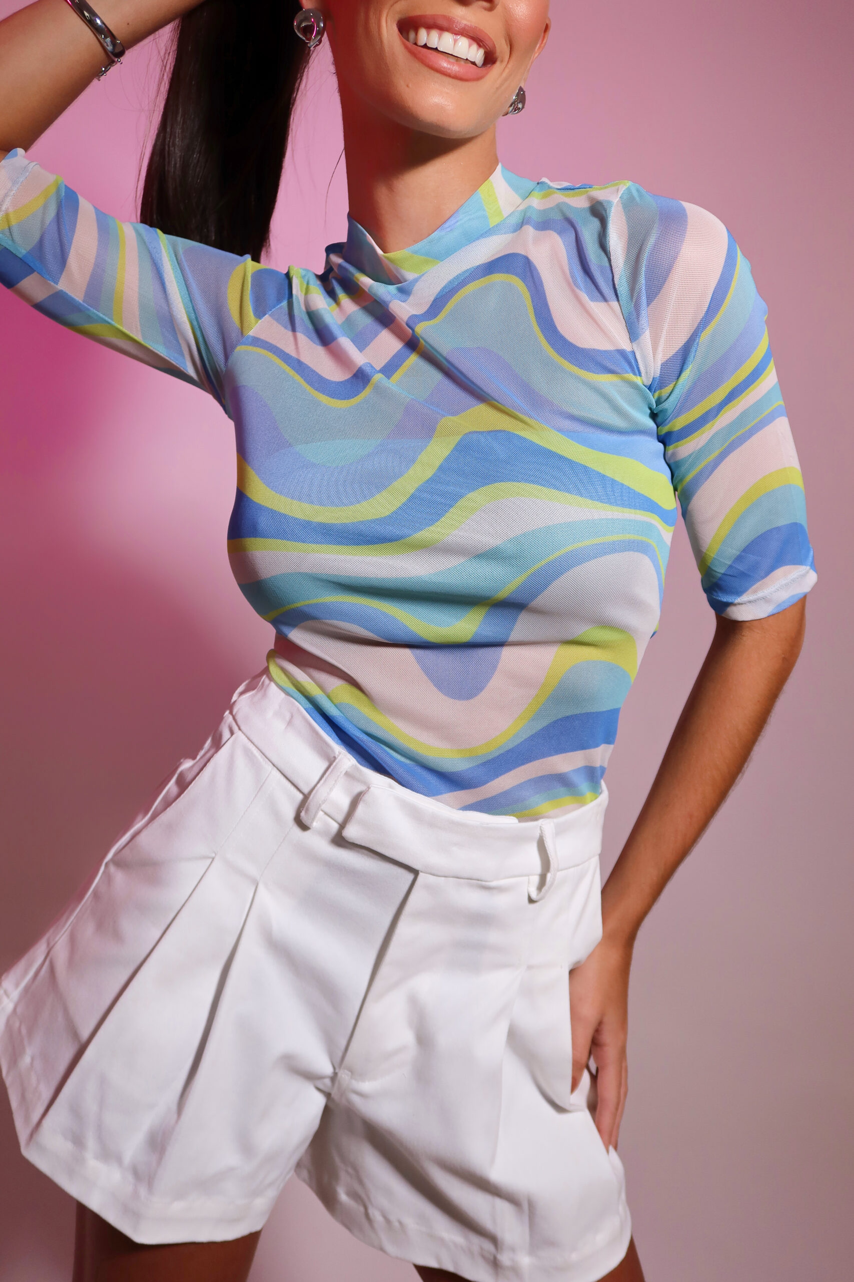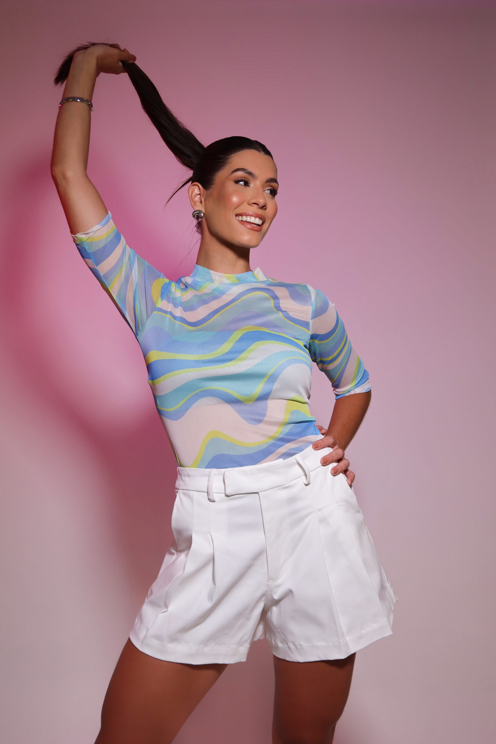 Detalhe: Short curto com detalhe de prega frontal. Bolso faca lateral e bolso traseiro. Possui passante de cinto.