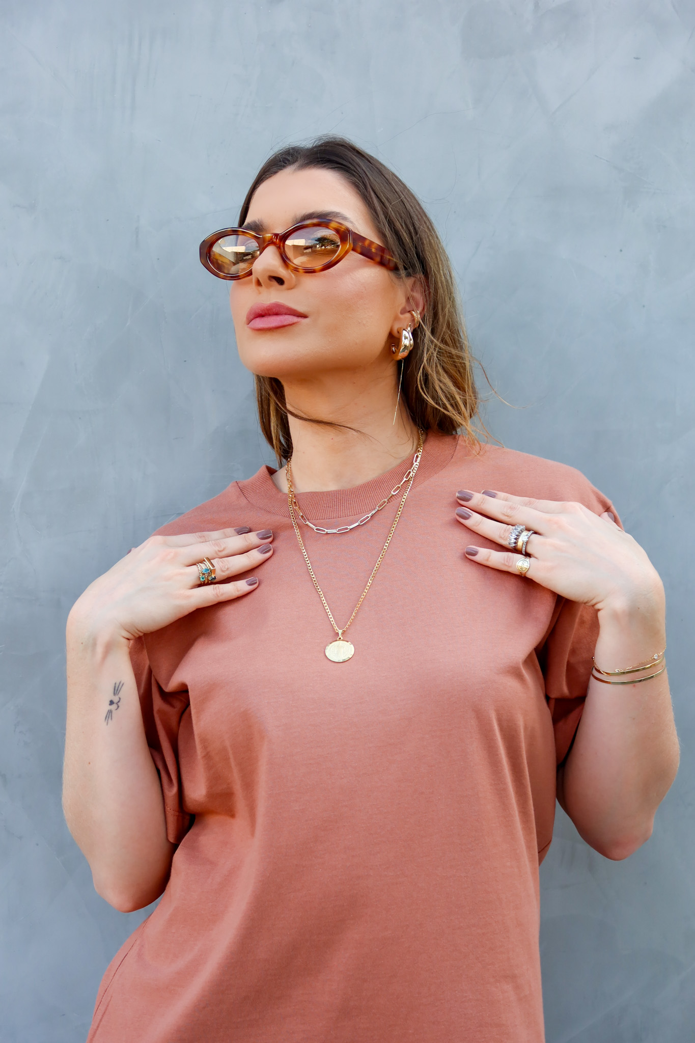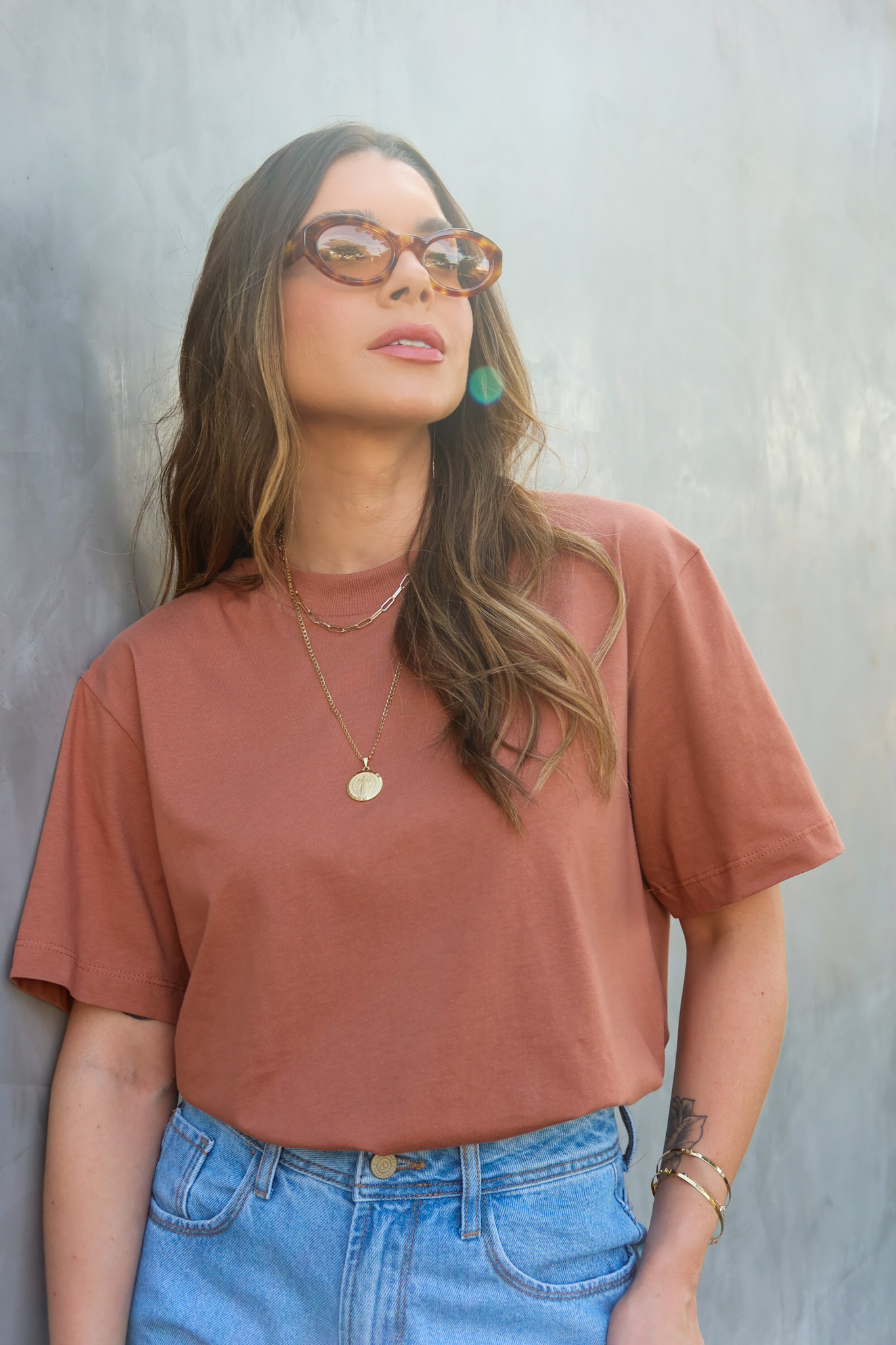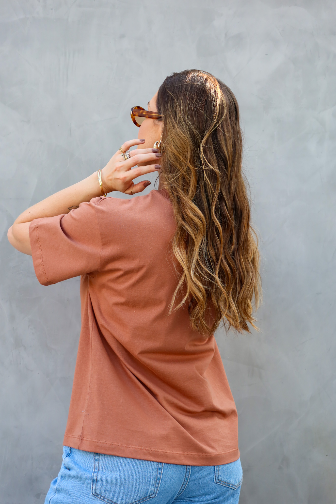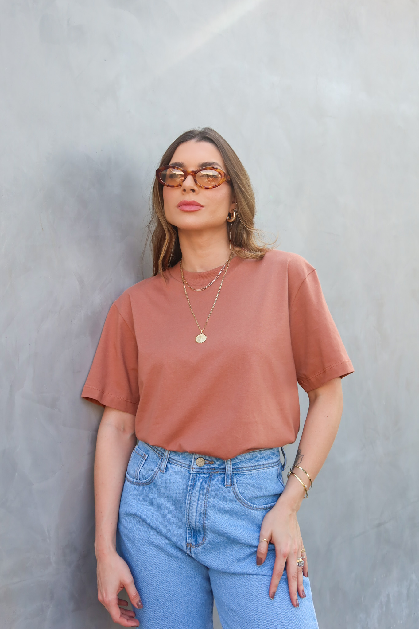 Detalhe: T-shirt com modelagem over lisa e gola em ribana.