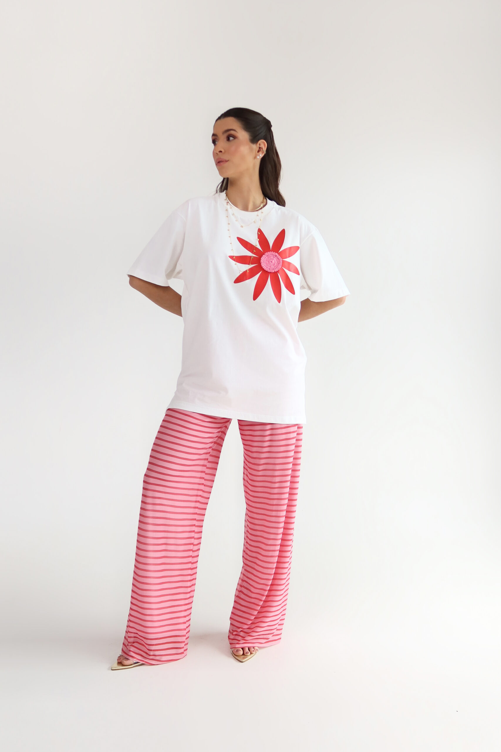 Detalhe: t-shirt com modelagem over. Estampa de flor vermelha e miolo com aplicação em crochê cor de rosa.