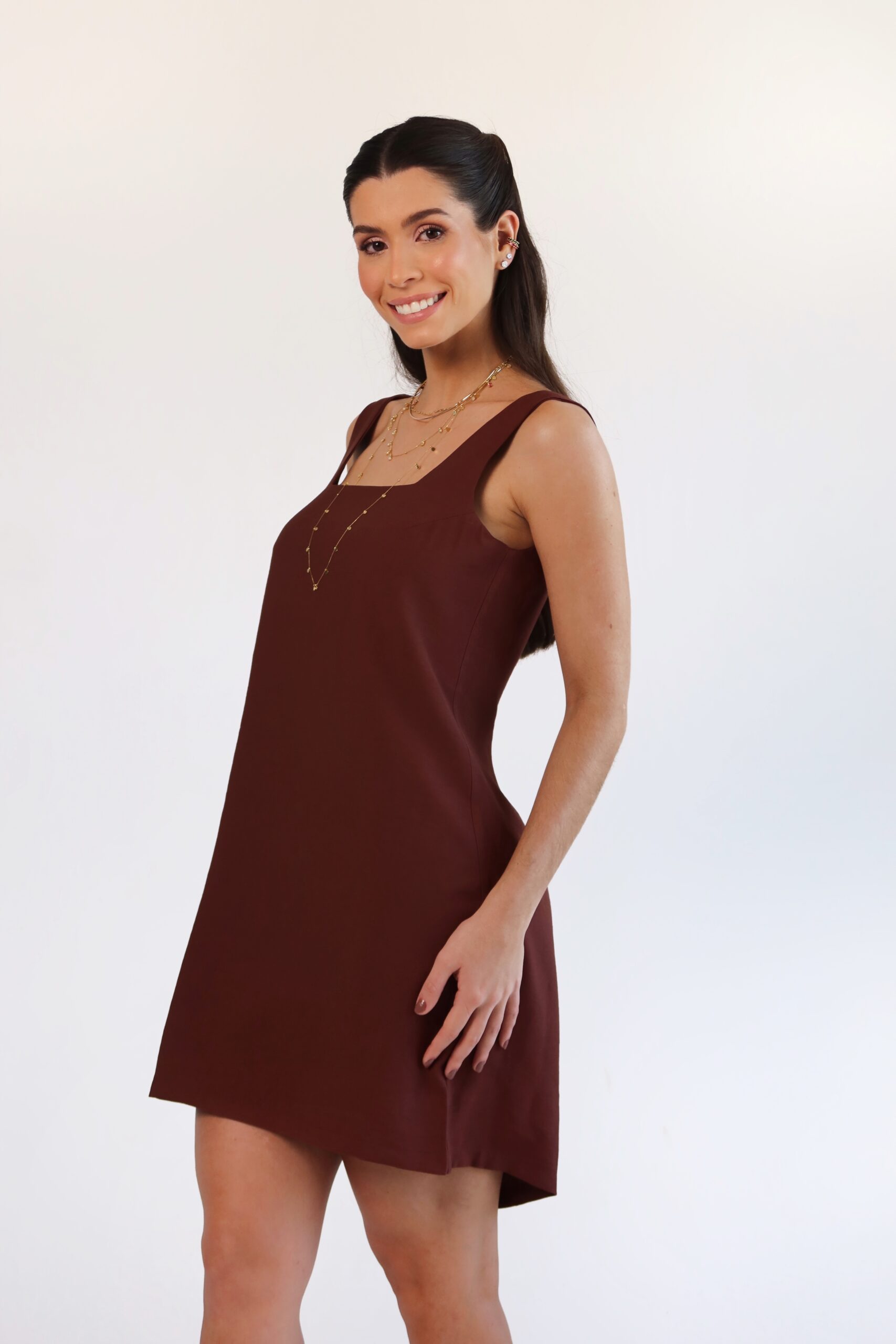Detalhe: Vestido curto em alfaiataria. Alças largas e decote quadrado. Fechamento em zíper traseiro.