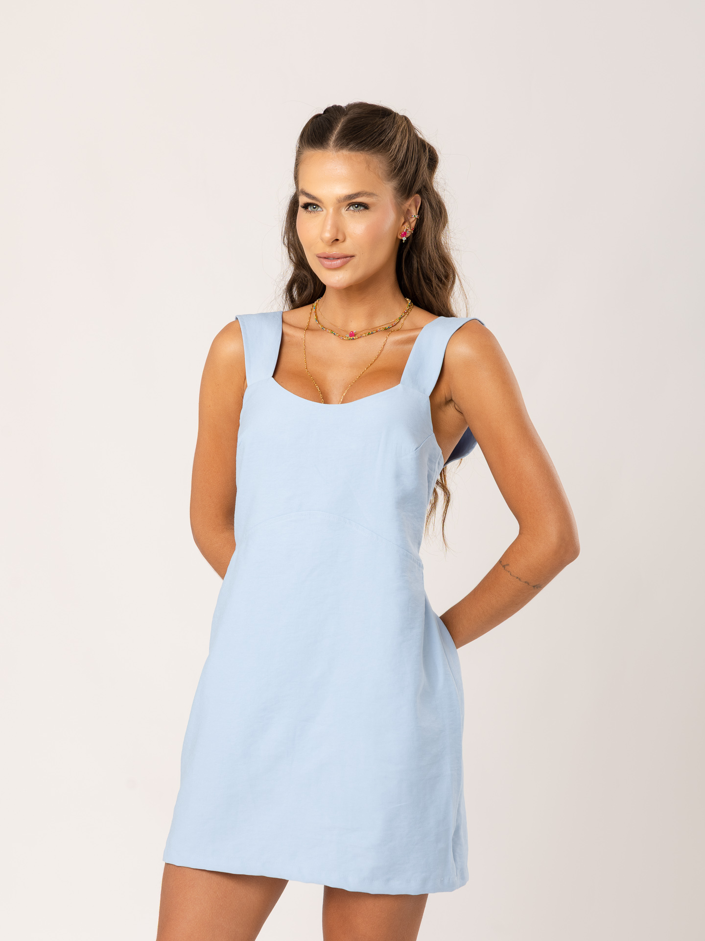 Detalhe: Vestido curto com alças largas e decote nas costas.
