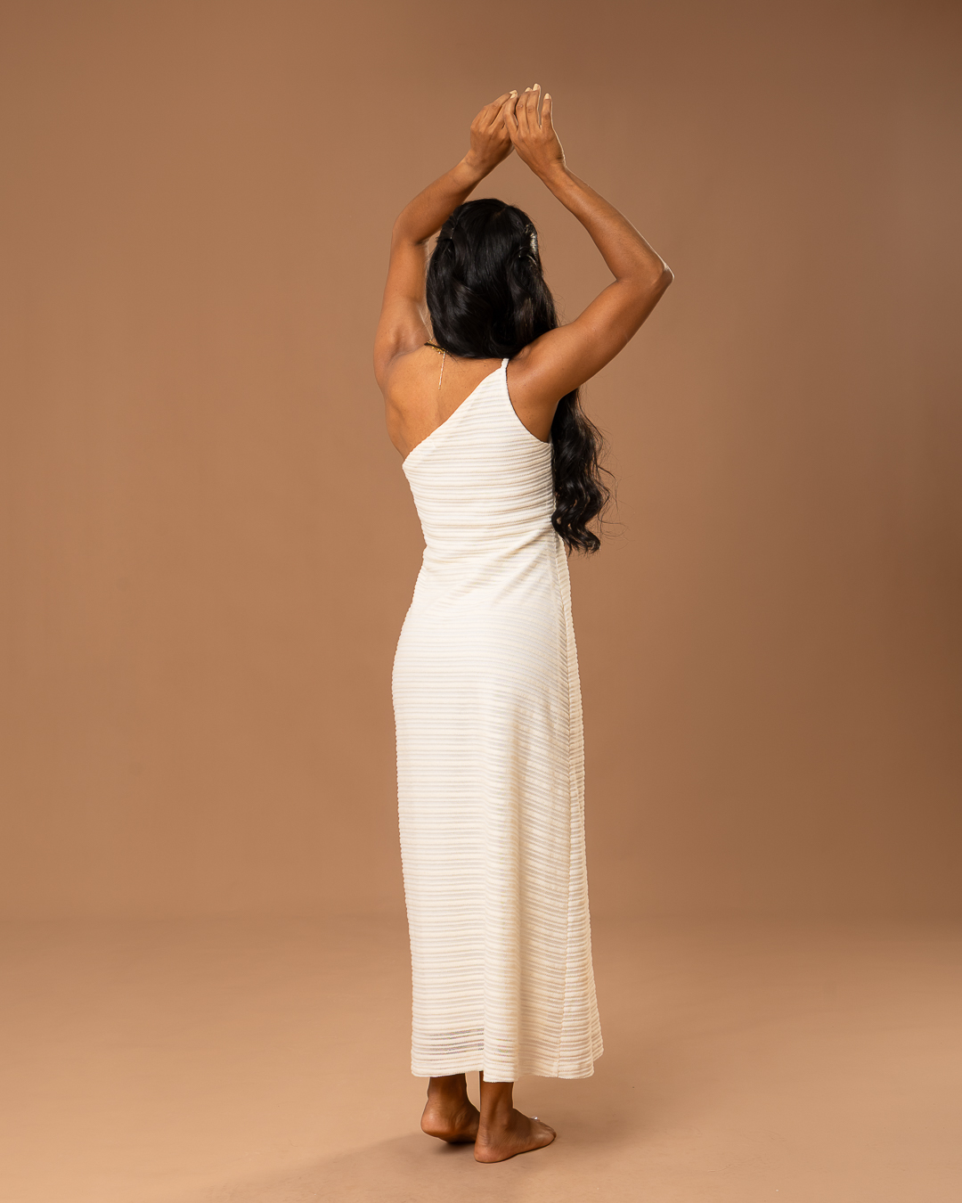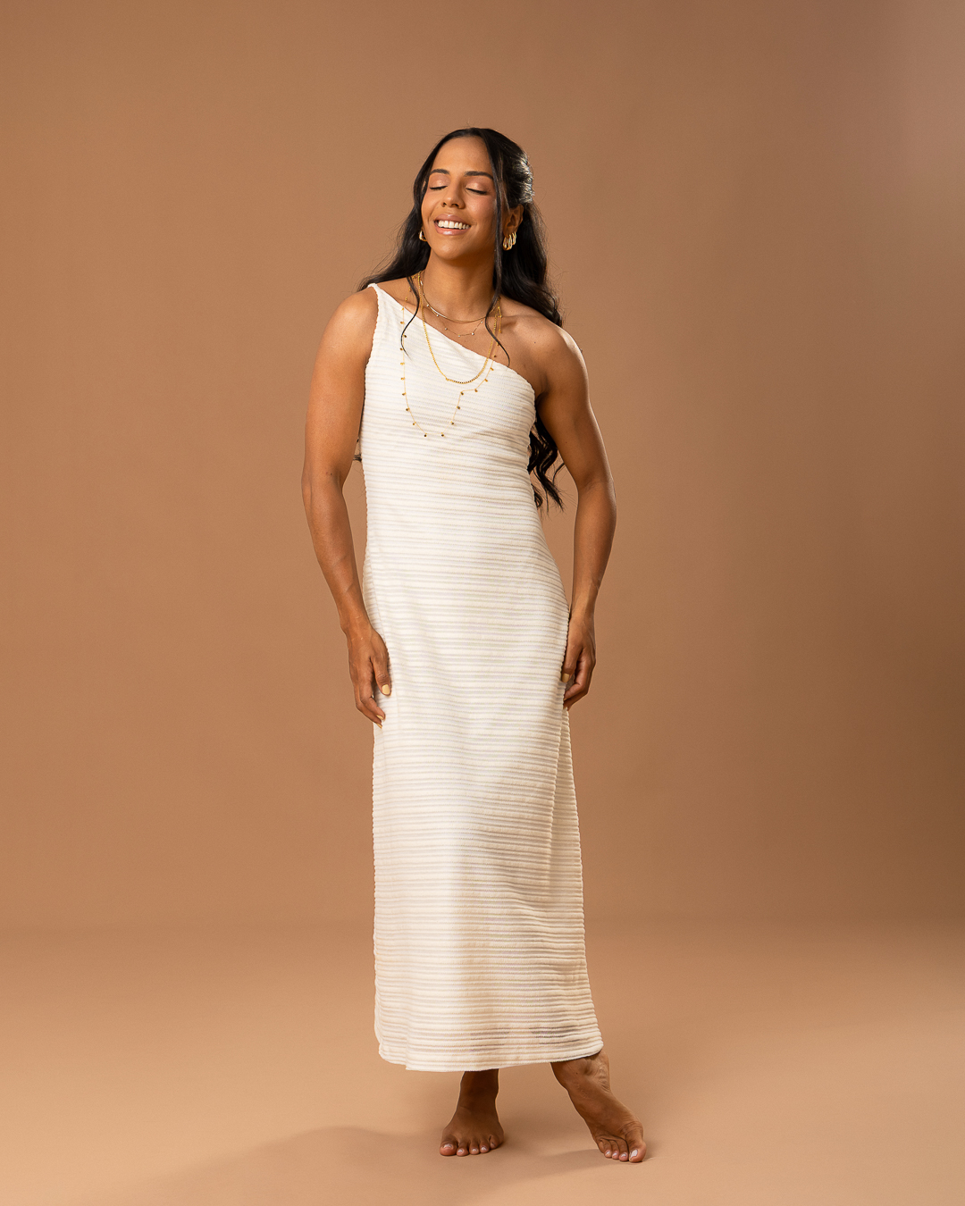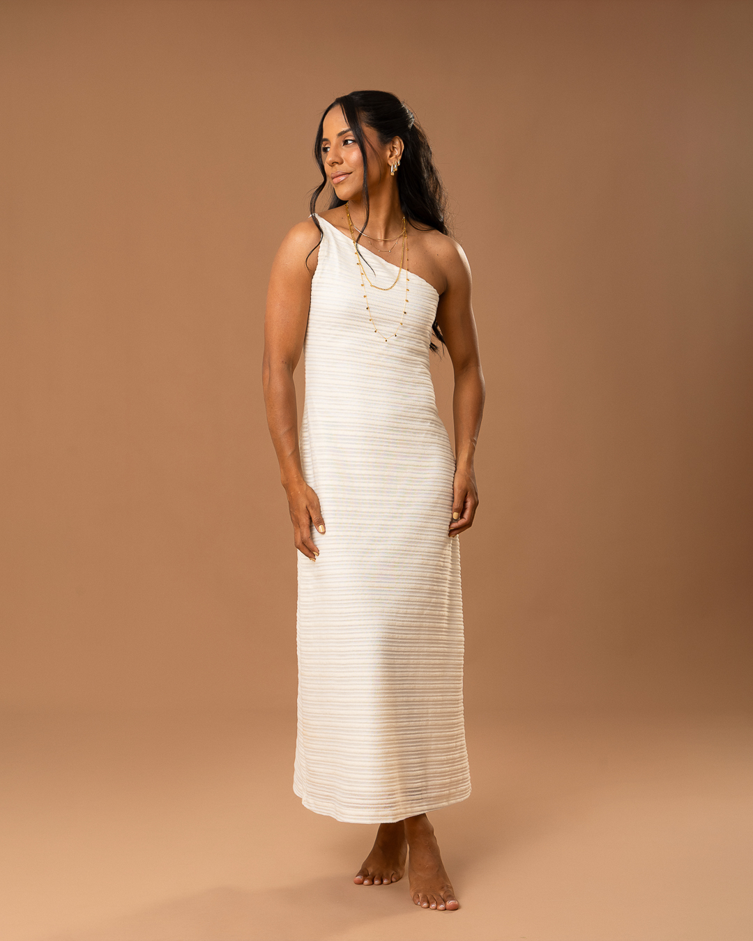 Detalhe: Vestido midi com modelagem ajustada ao corpo, forrado e um ombro só. De alcinha.