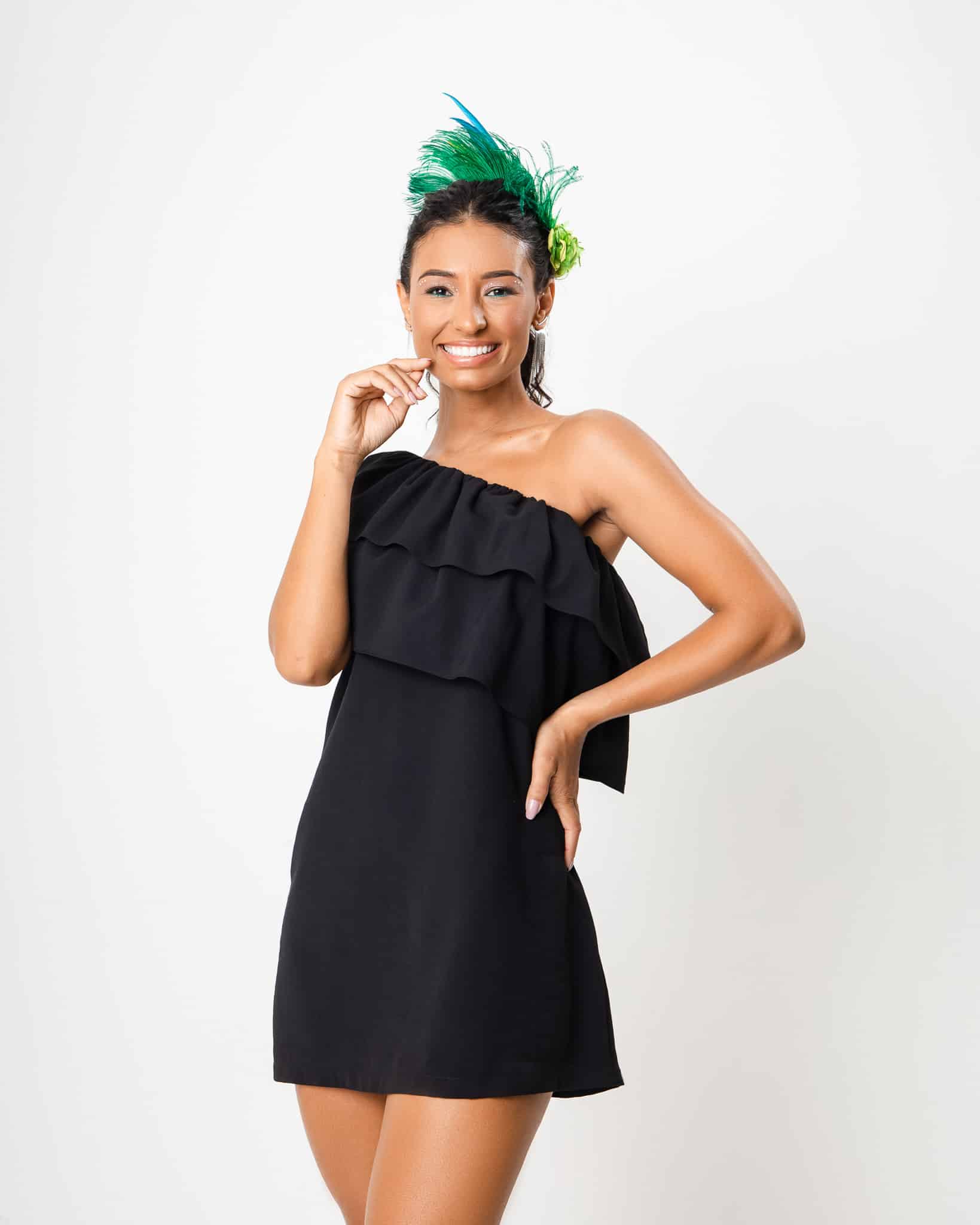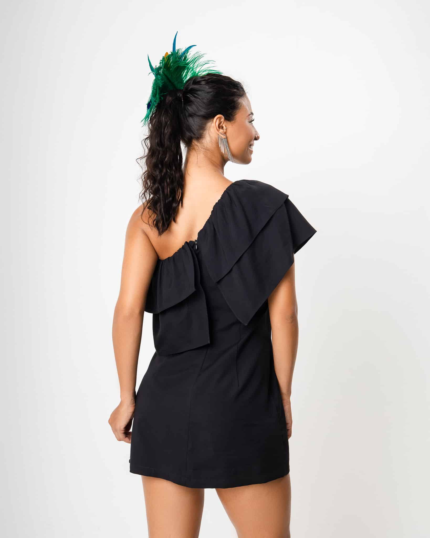 Vestido um ombro só com detalhe em babados.