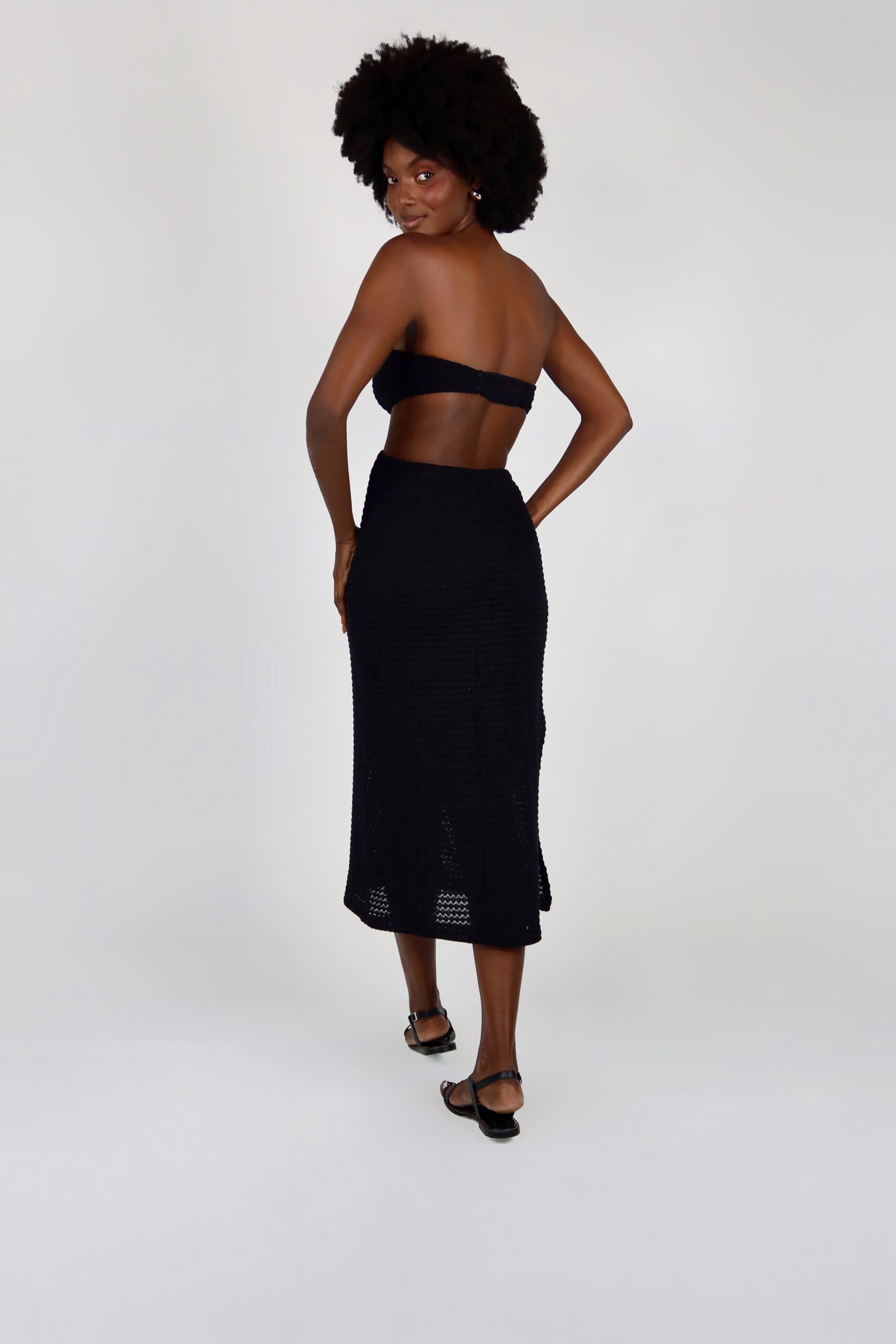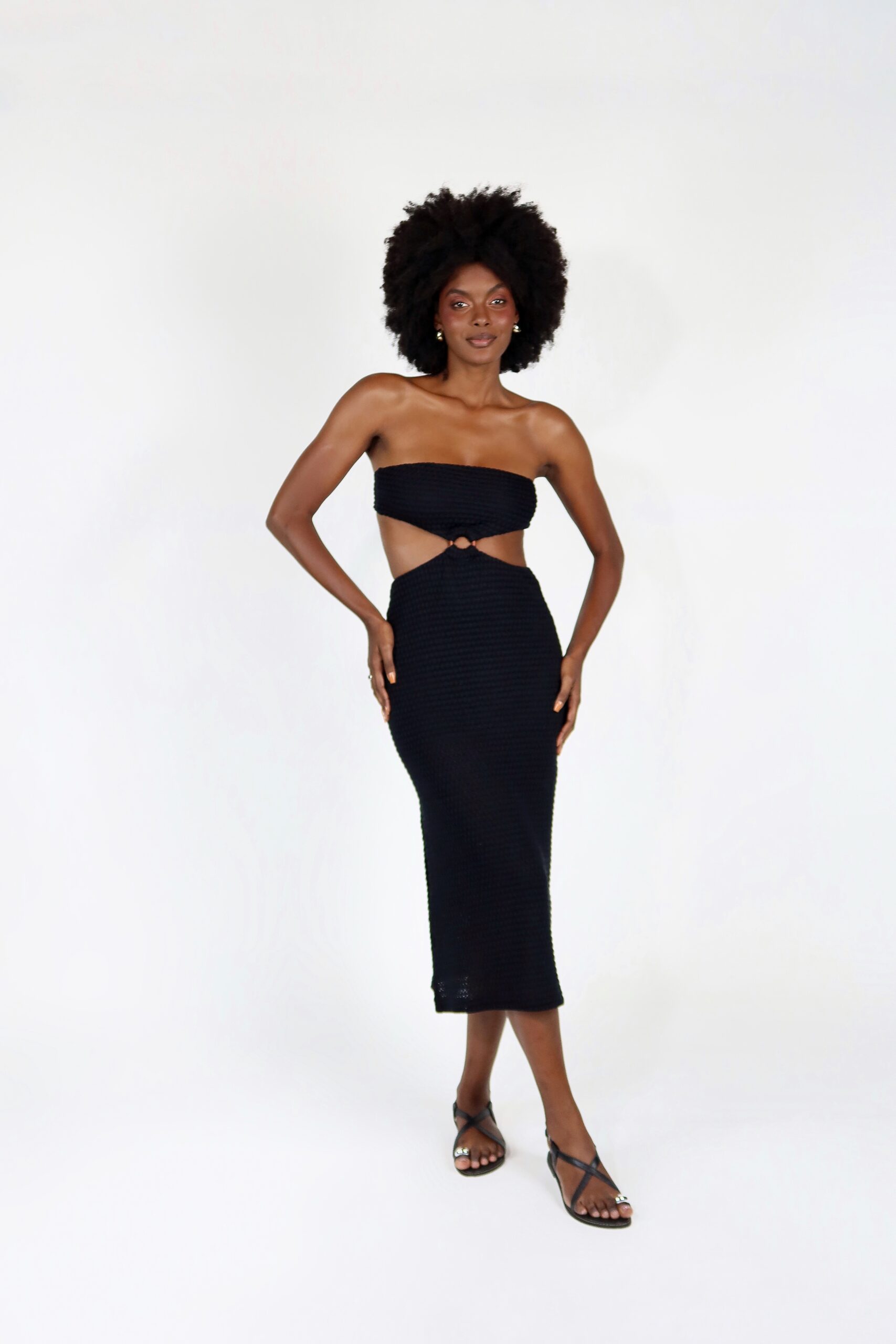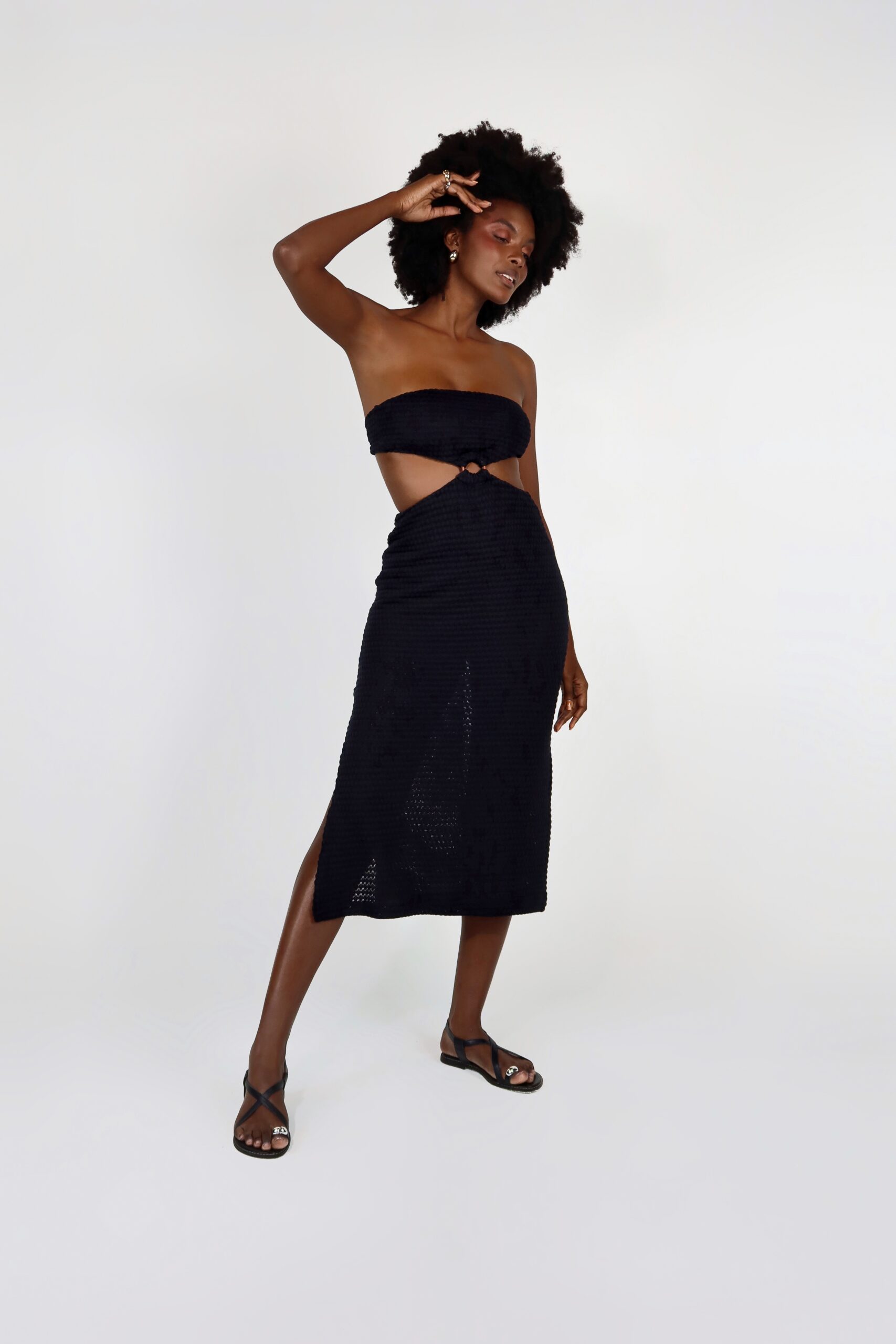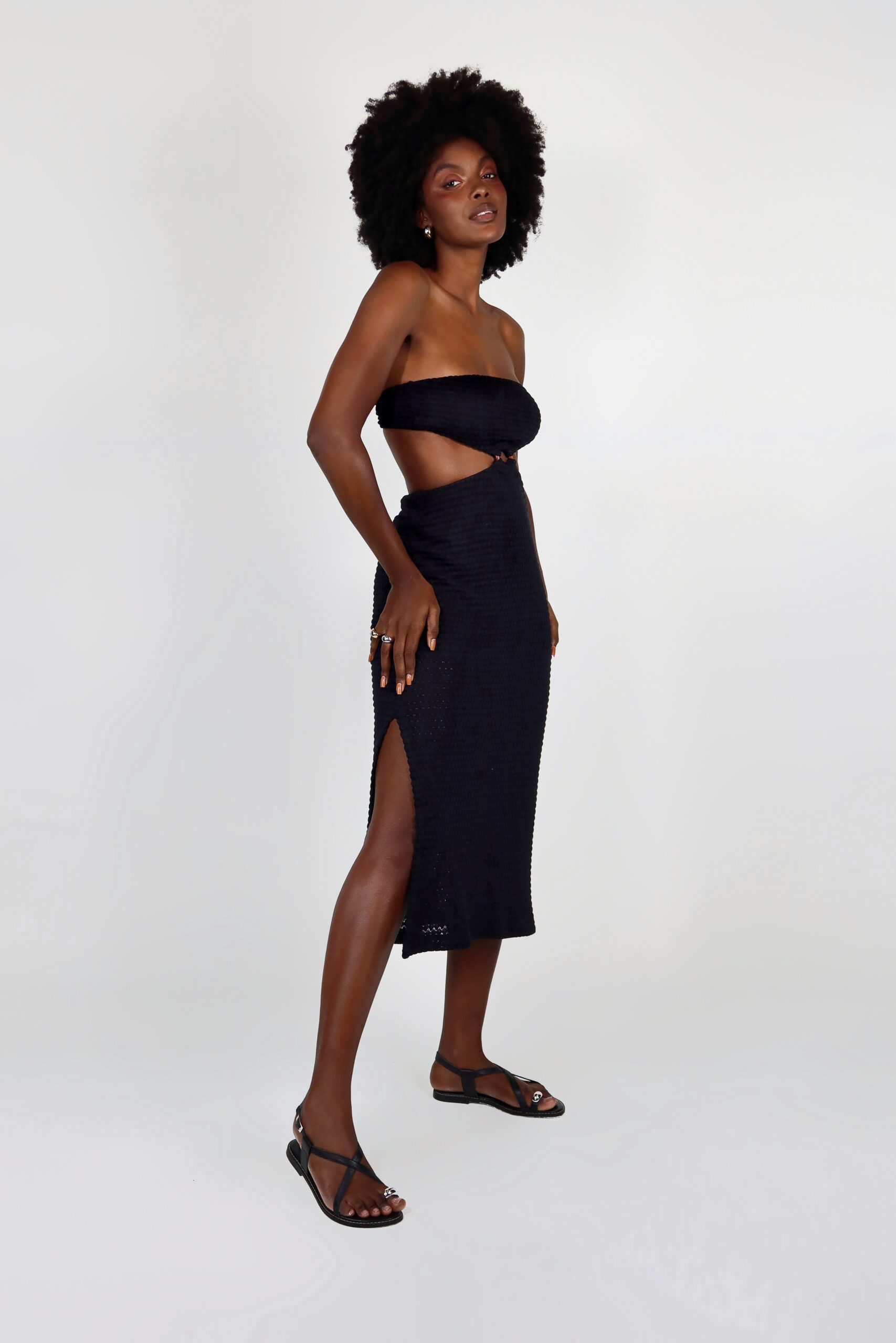 Detalhe: Vestido tomara que caia frente única, com ajuste em elástico nas costas. Recorte frontal e detalhe de argola em madeira na cintura. Fenda em uma lateral.